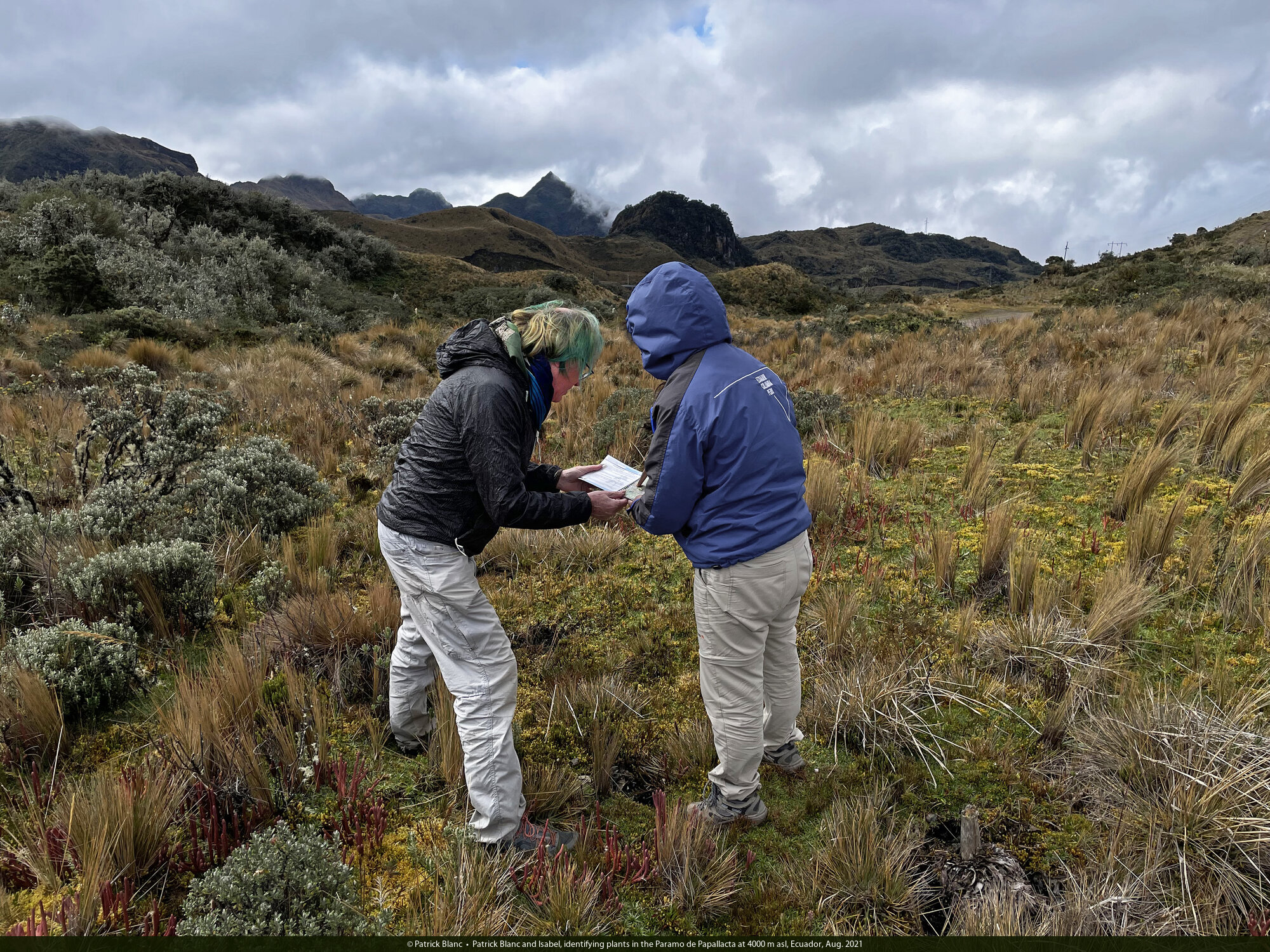 Patrick Blanc and Isabel, identifying plants in the Paramo de Papallacta at 4000 m asl, Ecuador, Aug. 2021