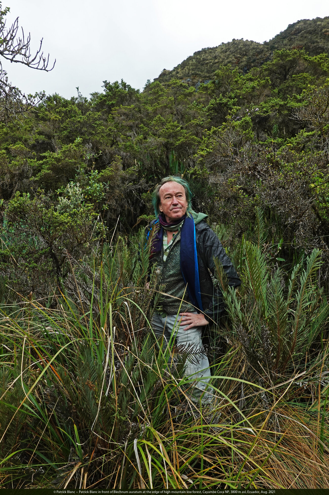 Patrick Blanc in front of Blechnum auratum at the edge of high mountain low forest, Cayambe Coca NP, 3800 m asl, Ecuador, Aug. 2021