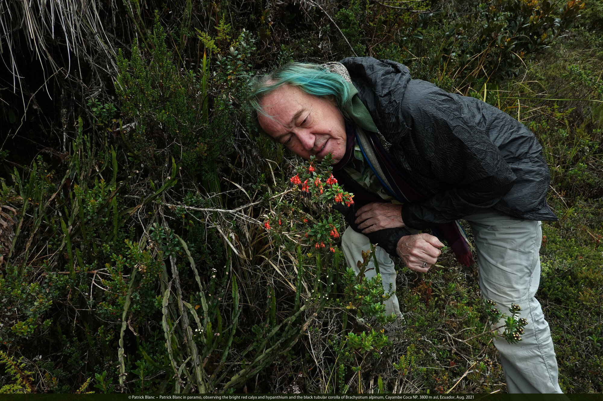 Patrick Blanc in paramo, observing the bright red calyx and hypanthium and the black tubular corolla of Brachyotum alpinum, Cayambe Coca NP, 3800 m asl, Ecuador, Aug. 2021