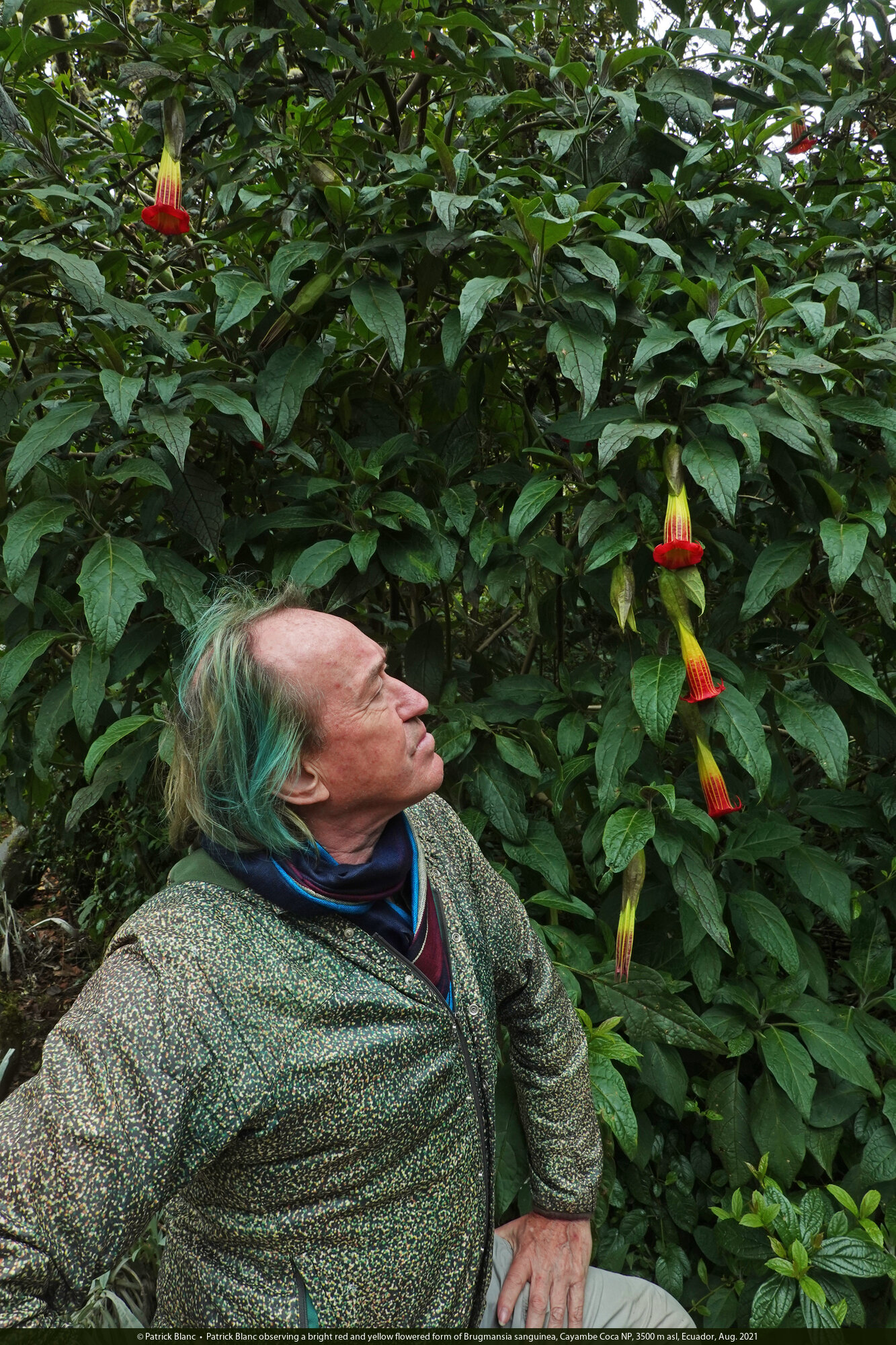 Patrick Blanc observing a bright red and yellow flowered form of Brugmansia sanguinea, Cayambe Coca NP, 3500 m asl, Ecuador, Aug. 2021