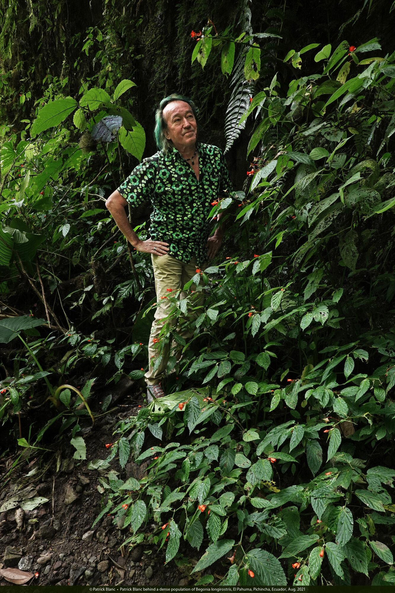 Patrick Blanc behind a dense population of Begonia longirostris, El Pahuma, Pichincha, Ecuador, Aug. 2021