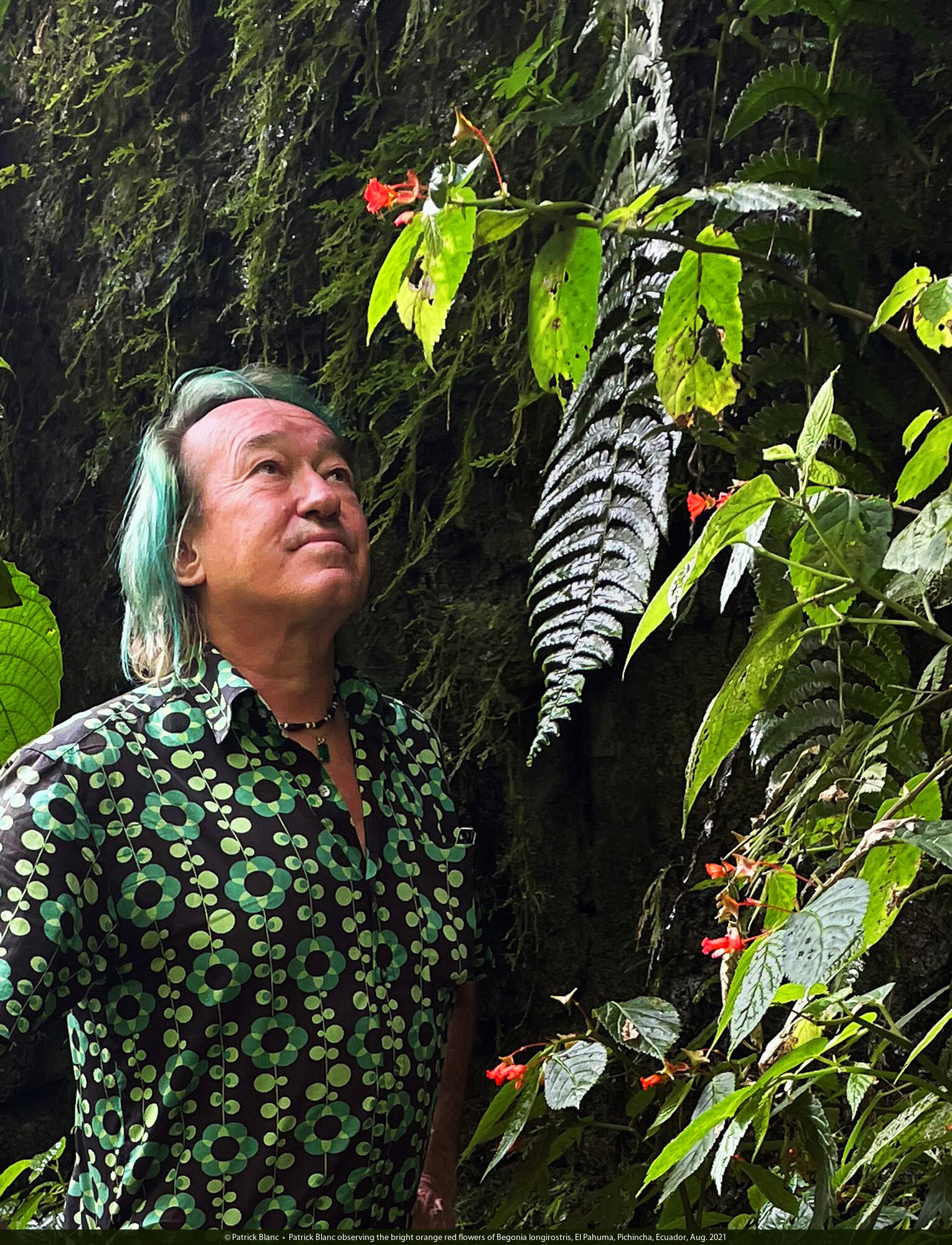 Patrick Blanc observing the bright orange red flowers of Begonia longirostris, El Pahuma, Pichincha, Ecuador, Aug. 2021