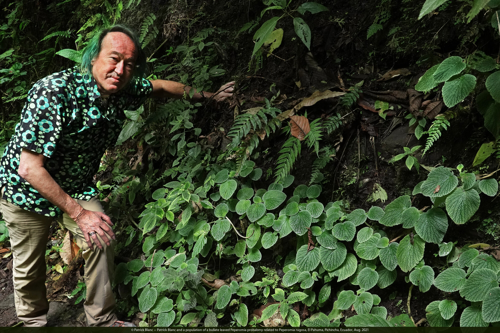 Patrick Blanc and a population of the bullate leaved Peperomia camposii, El Pahuma, Pichincha, Ecuador, Aug. 2021