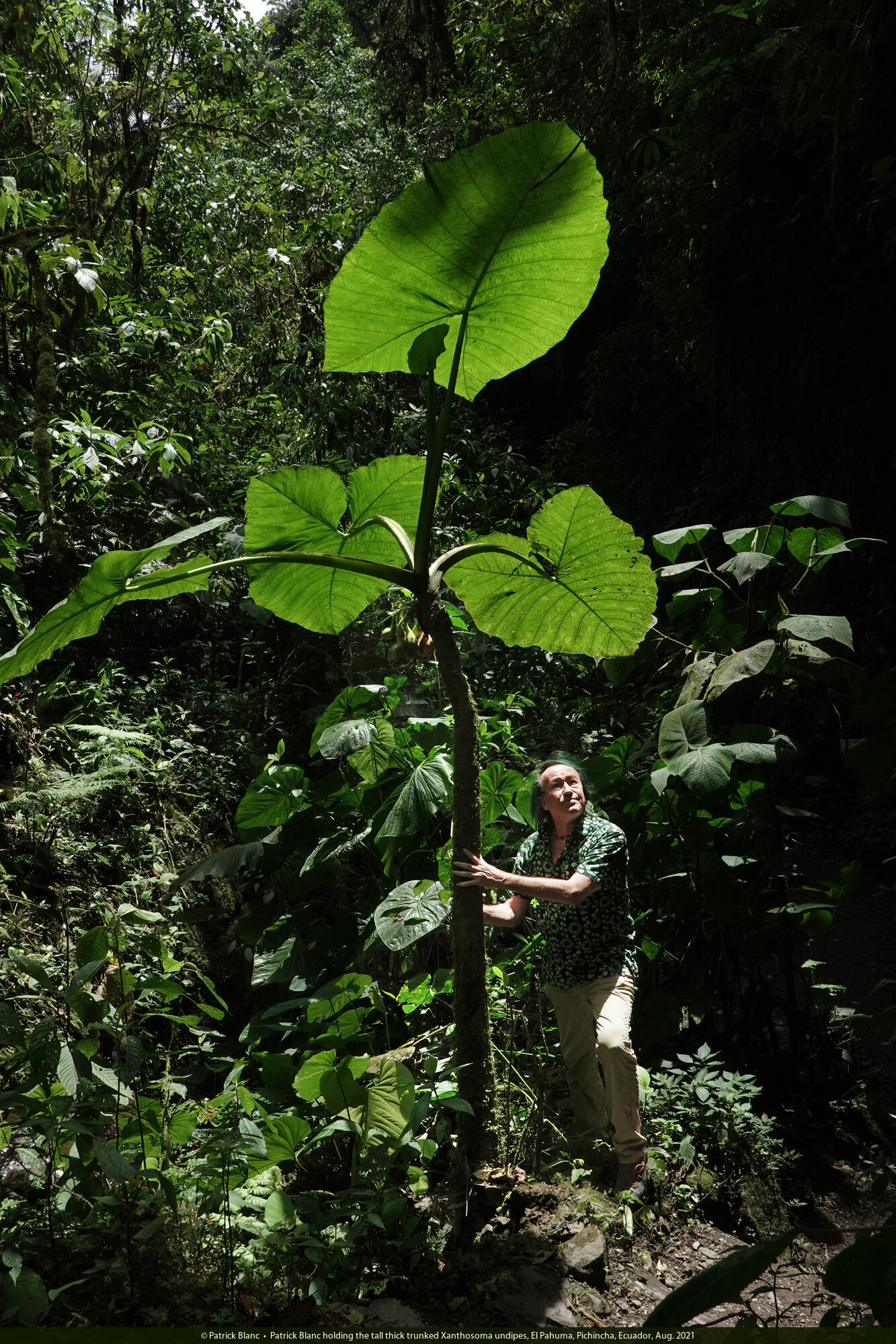 Patrick Blanc holding the tall thick trunked Xanthosoma undipes, El Pahuma, Pichincha, Ecuador, Aug. 2021