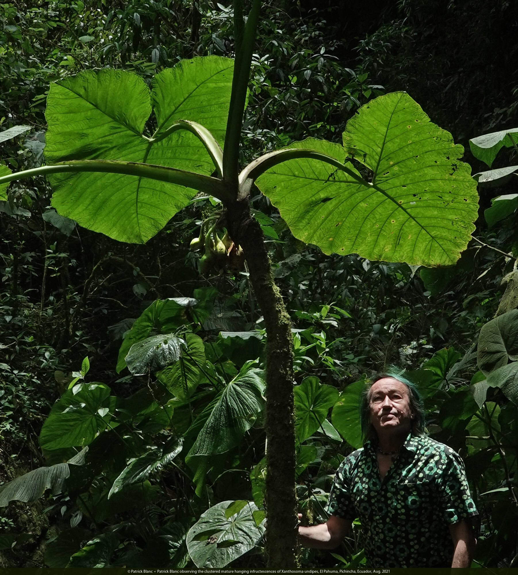 Patrick Blanc observing the clustered mature hanging infructescences of Xanthosoma undipes, El Pahuma, Pichincha, Ecuador, Aug. 2021