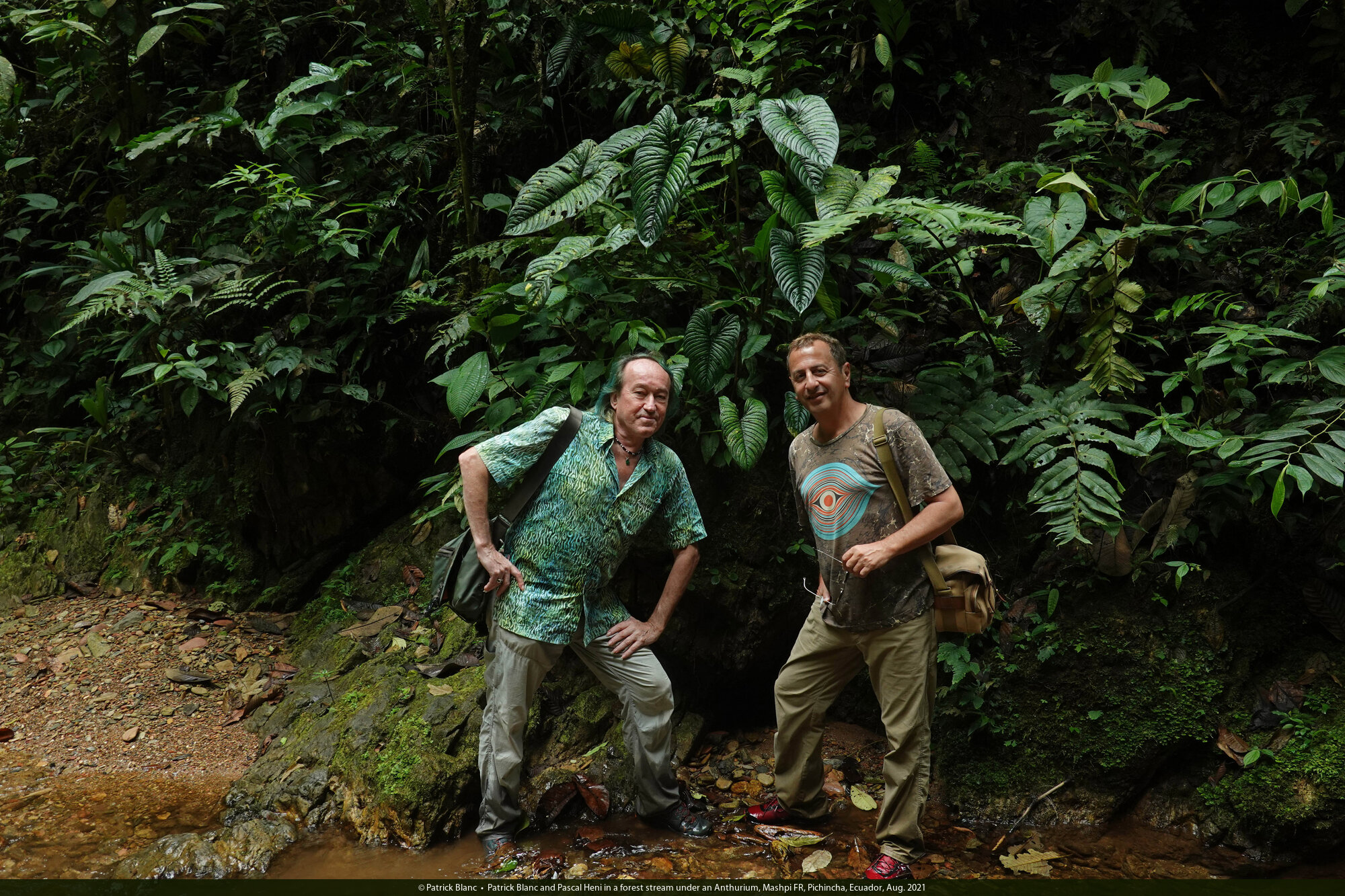 Patrick Blanc and Pascal Heni in a forest stream under Philodendron lynnhannoniae, Mashpi FR, Pichincha, Ecuador, Aug. 2021