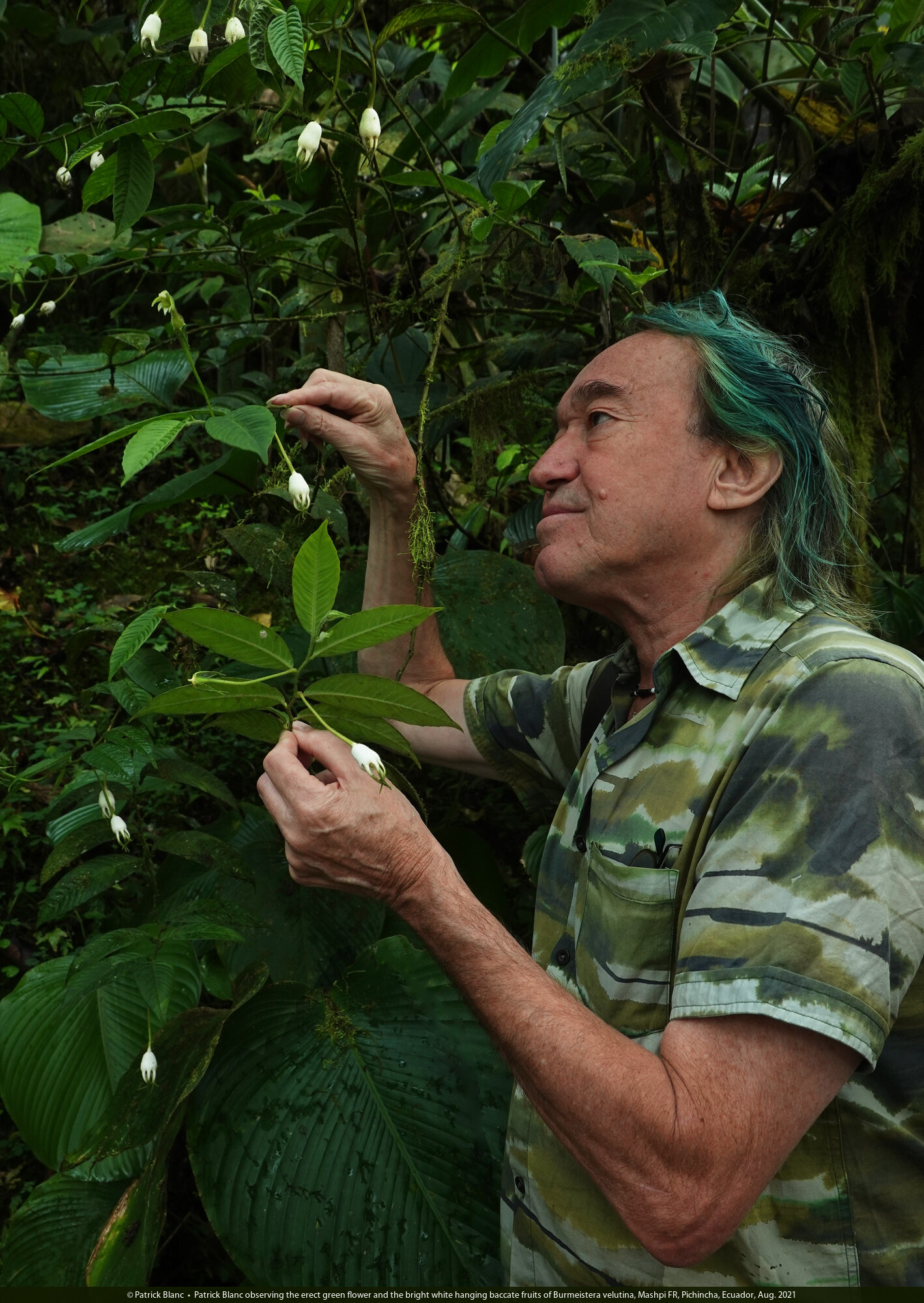 Patrick Blanc observing the erect green flower and the bright white hanging baccate fruits of Burmeistera velutina, Mashpi FR, Pichincha, Ecuador, Aug. 2021