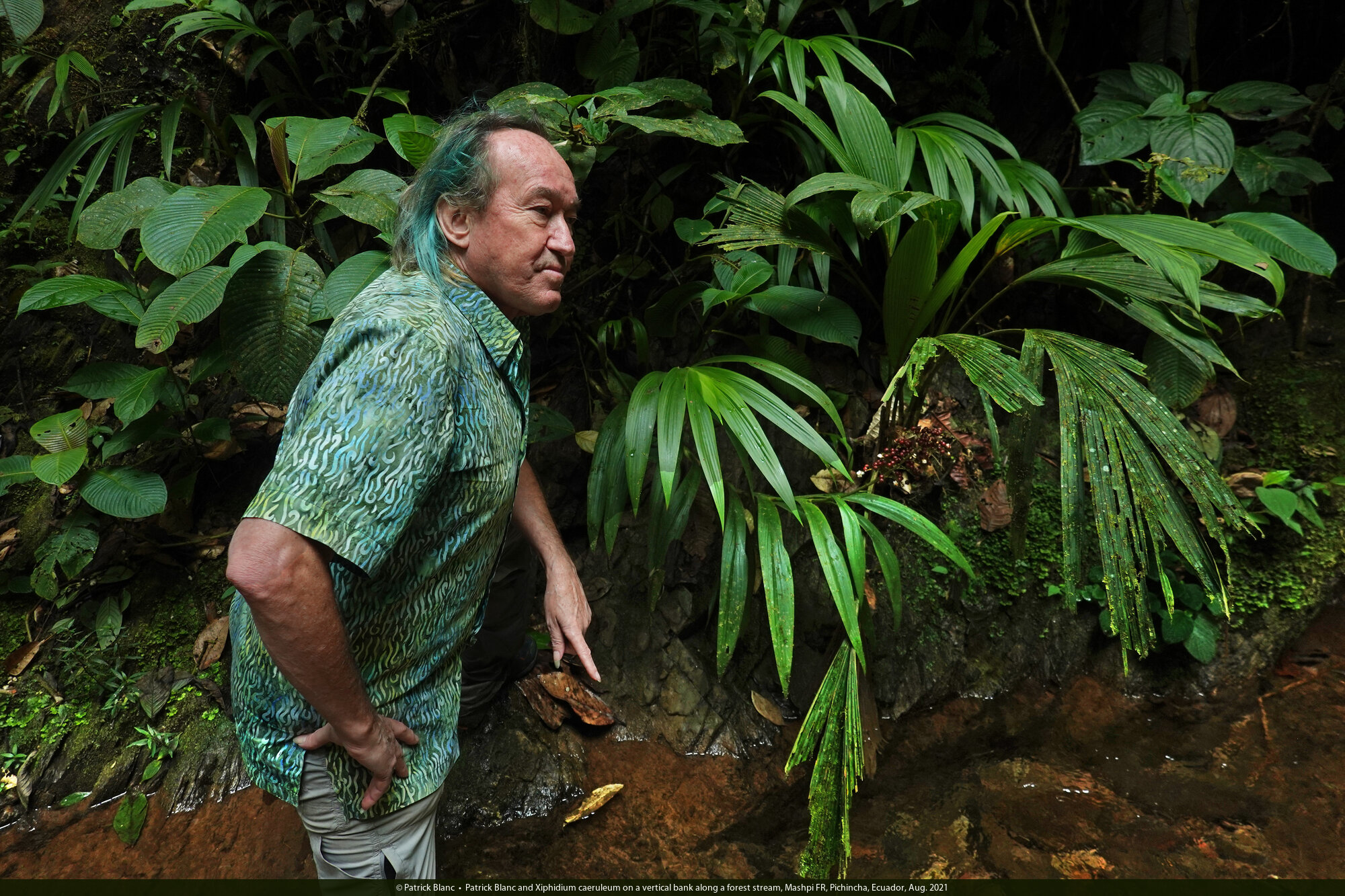 Patrick Blanc and Xiphidium caeruleum on a vertical bank along a forest stream, Mashpi FR, Pichincha, Ecuador, Aug. 2021
