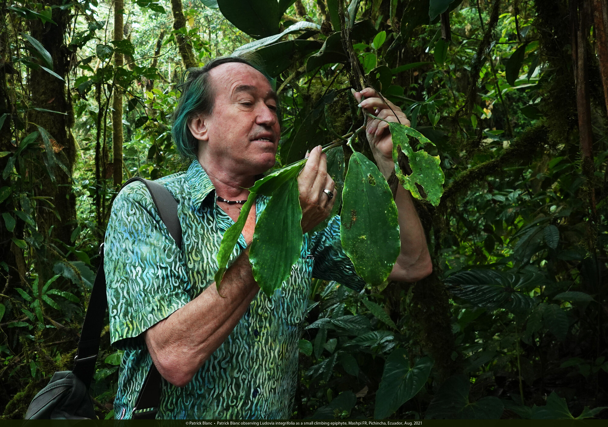 Patrick Blanc observing Ludovia integrifolia as a small climbing epiphyte, Mashpi FR, Pichincha, Ecuador, Aug. 2021
