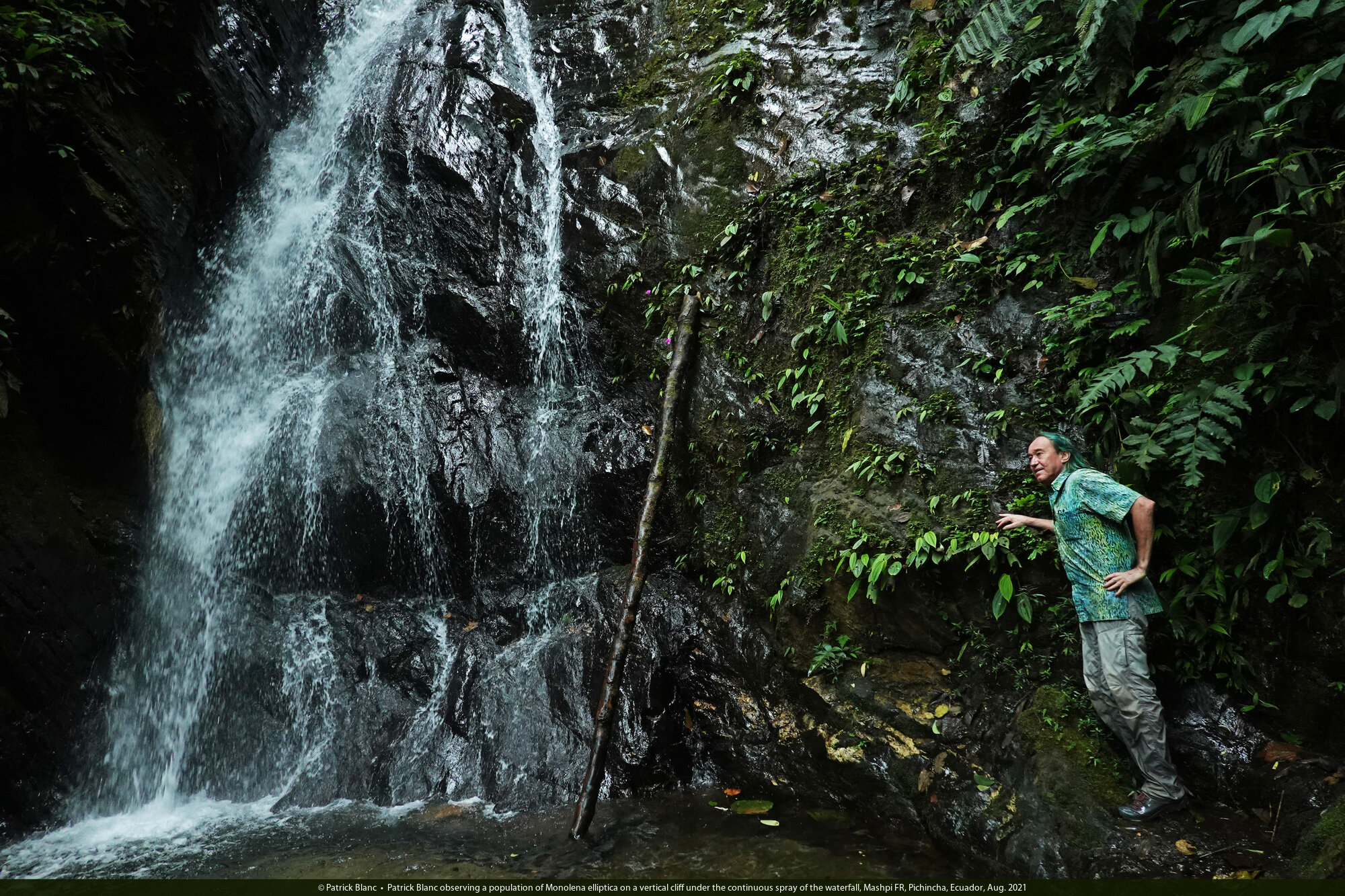 Patrick Blanc observing a population of Monolena elliptica on a vertical cliff under the continuous spray of the waterfall, Mashpi FR, Pichincha, Ecuador, Aug. 2021