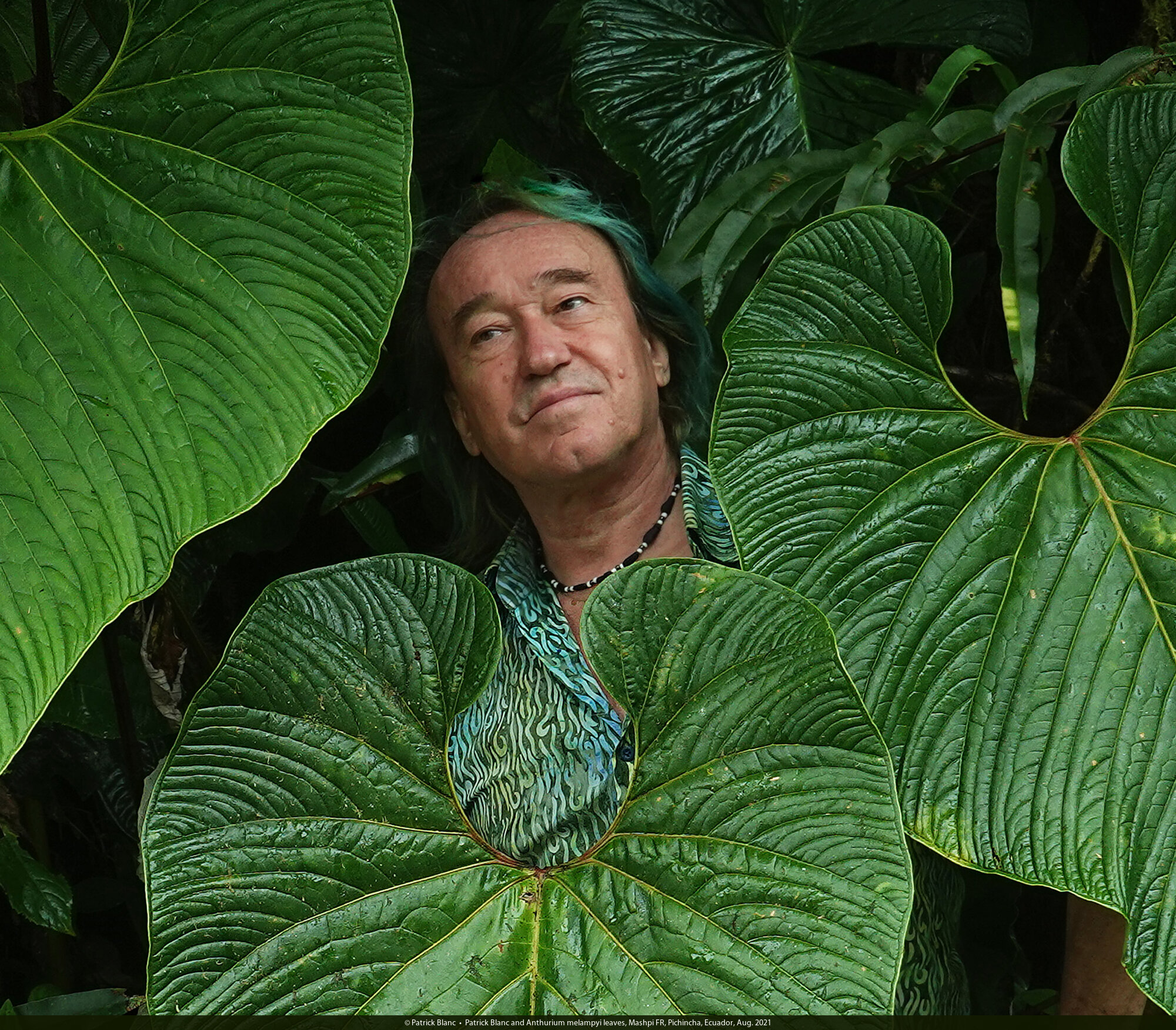 Patrick Blanc and Anthurium melampyi leaves, Mashpi FR, Pichincha, Ecuador, Aug. 2021