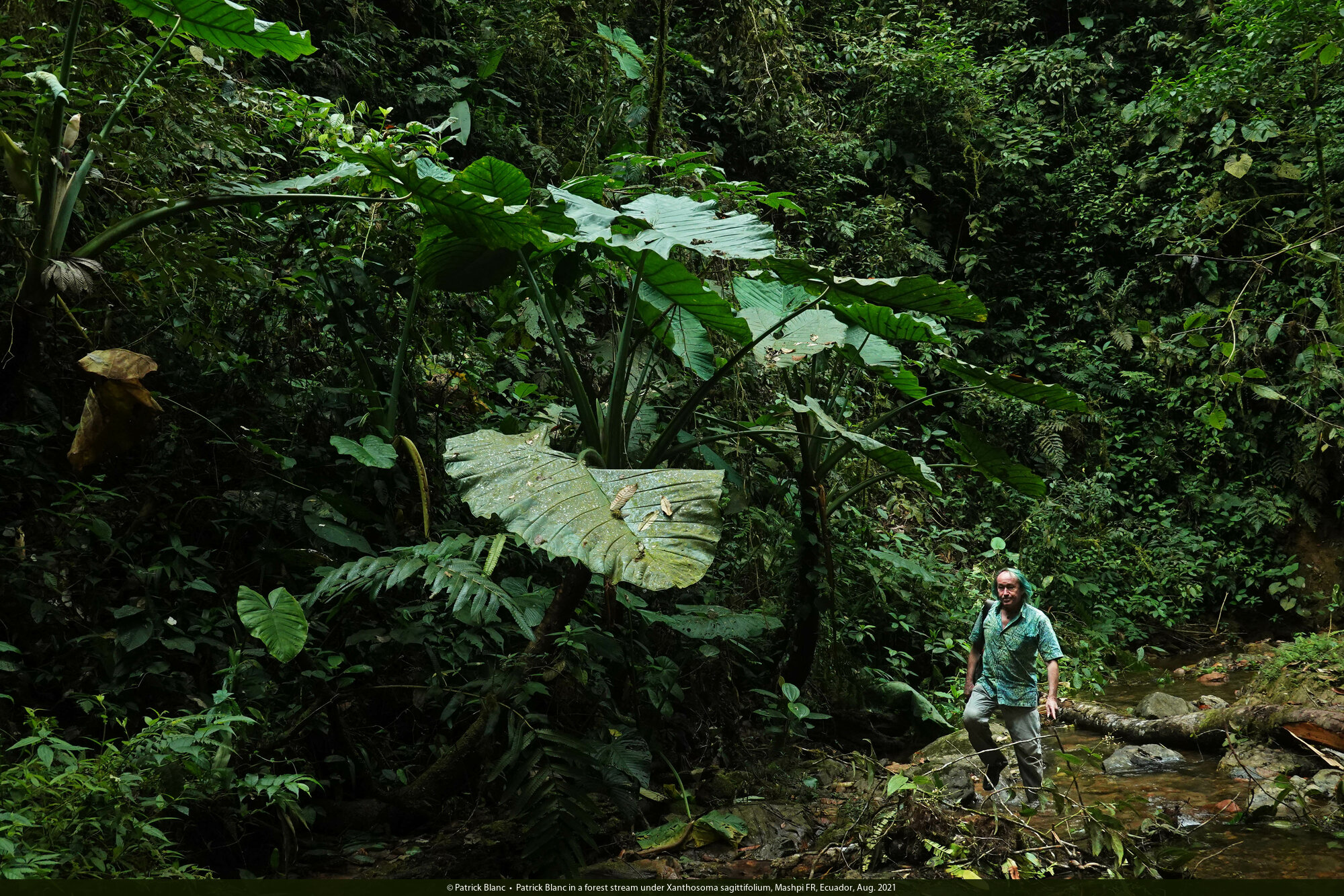Patrick Blanc in a forest stream under Xanthosoma sagittifolium, Mashpi FR, Ecuador, Aug. 2021