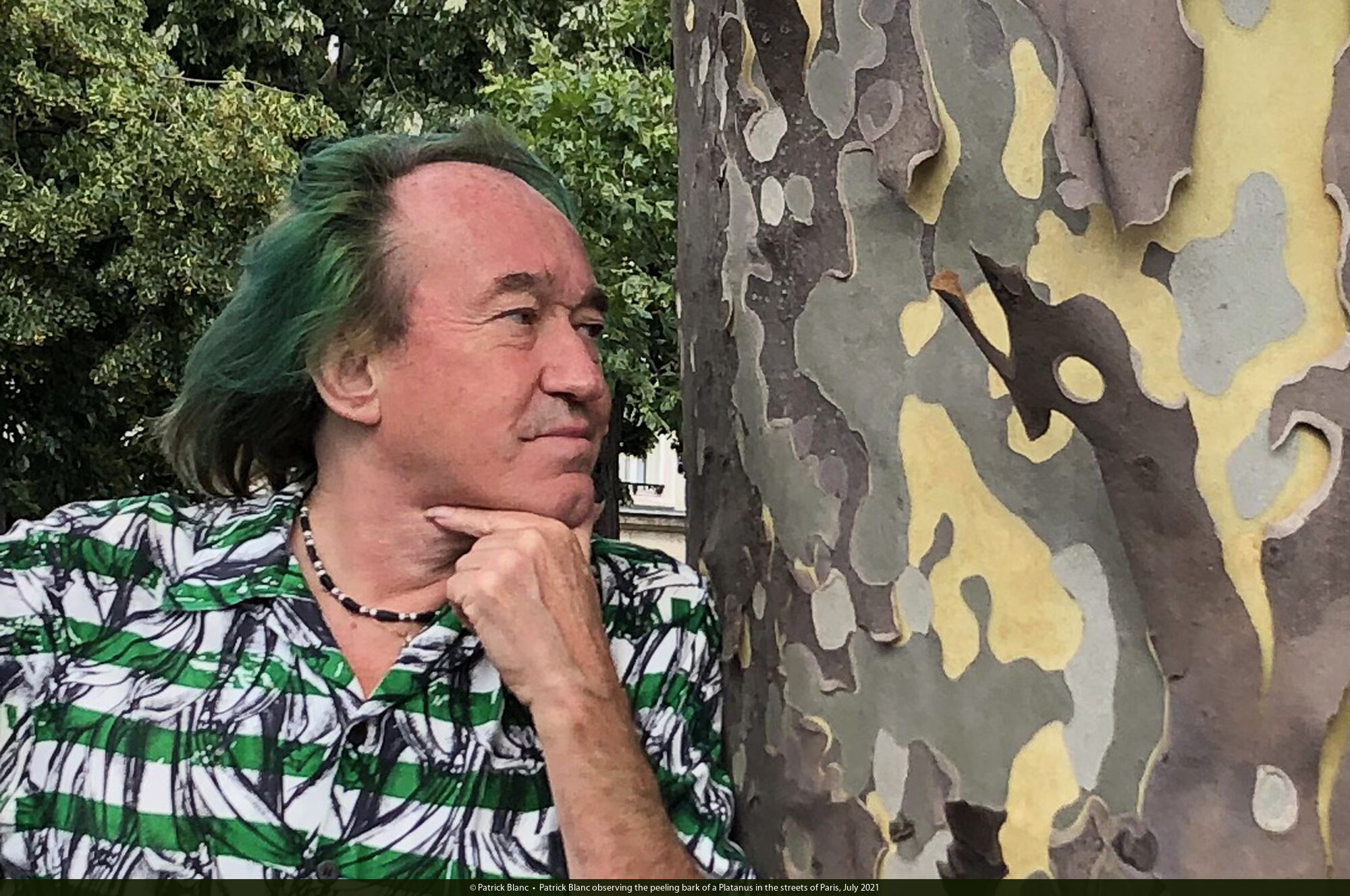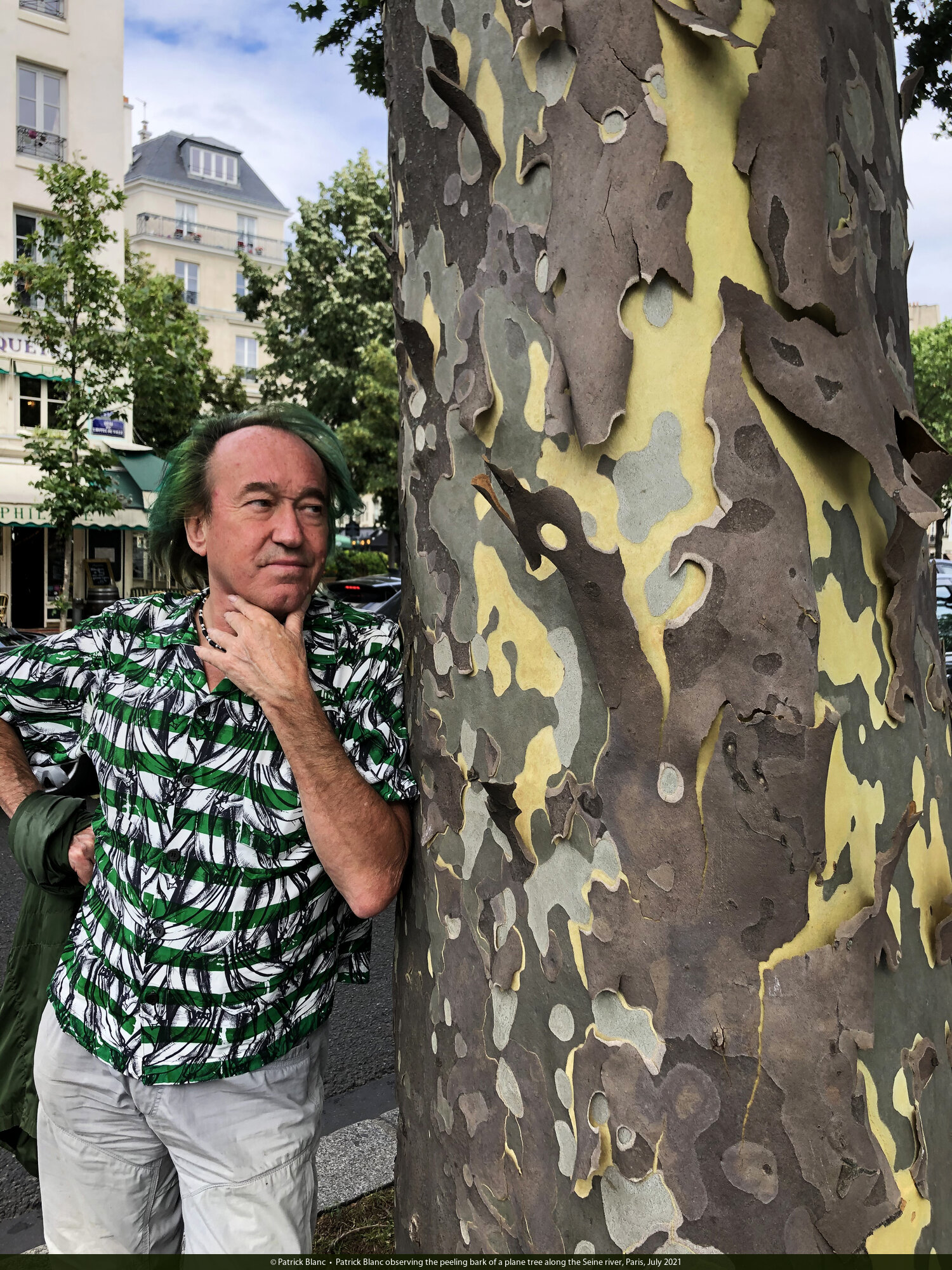 Patrick Blanc observing the peeling bark of a Platanus in the streets of Paris, July 2021