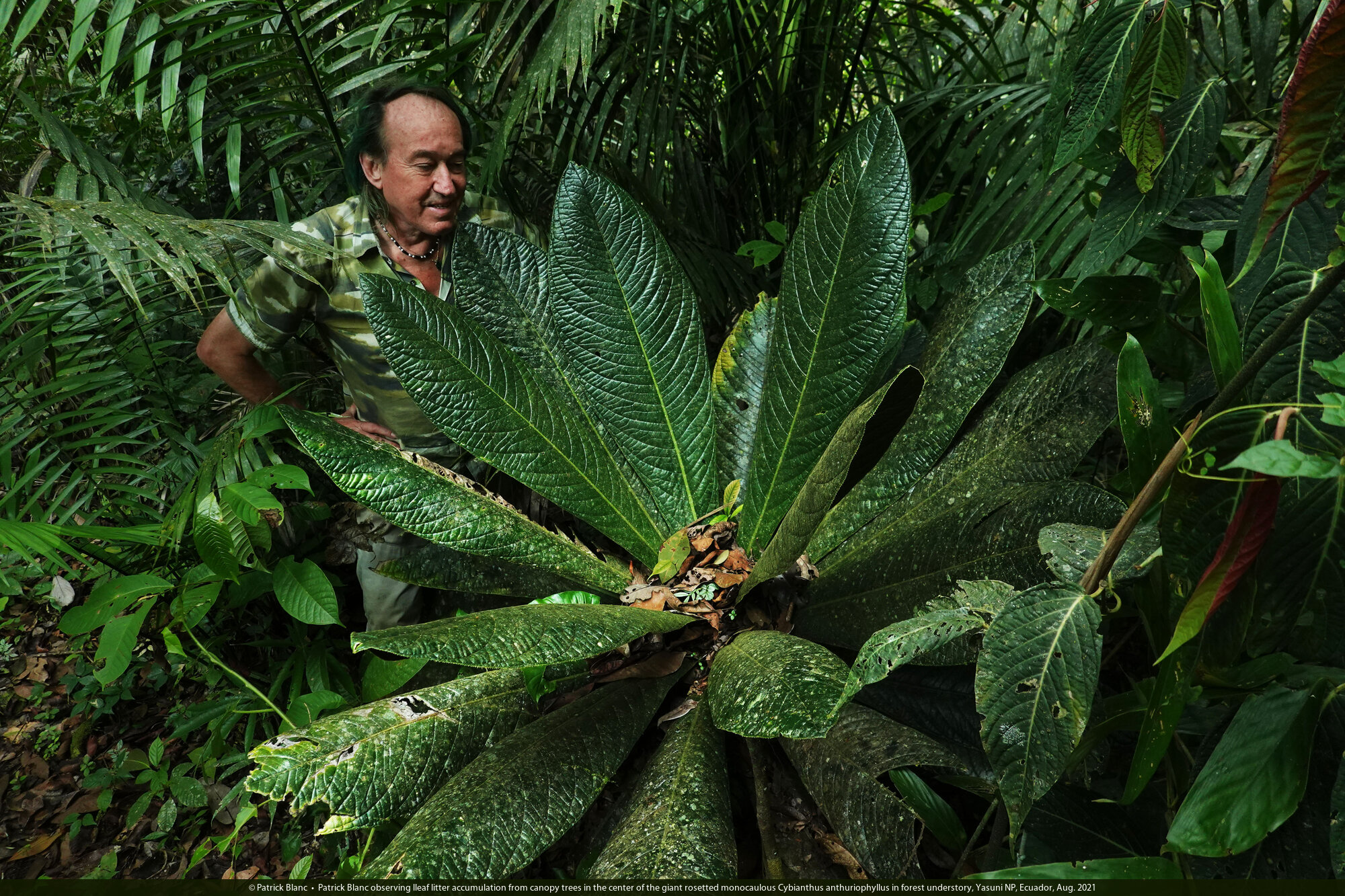 Patrick Blanc observing lleaf litter accumulation from canopy trees in the center of the giant rosetted monocaulous Cybianthus anthuriophyllus in forest understory, Yasuni NP, Ecuador, Aug. 2021