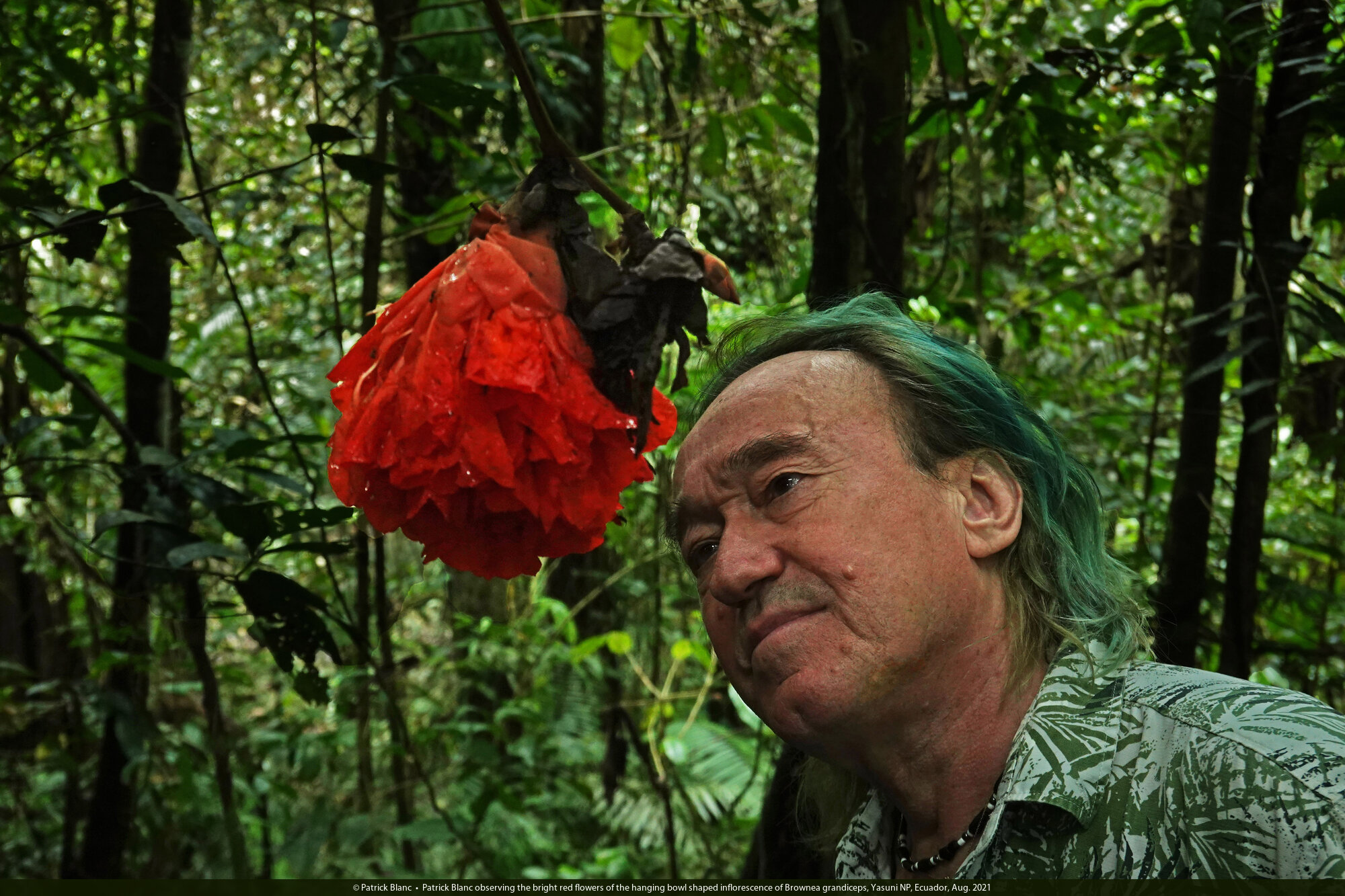 Patrick Blanc observing the bright red flowers of the hanging bowl shaped inflorescence of Brownea grandiceps, Yasuni NP, Ecuador, Aug. 2021