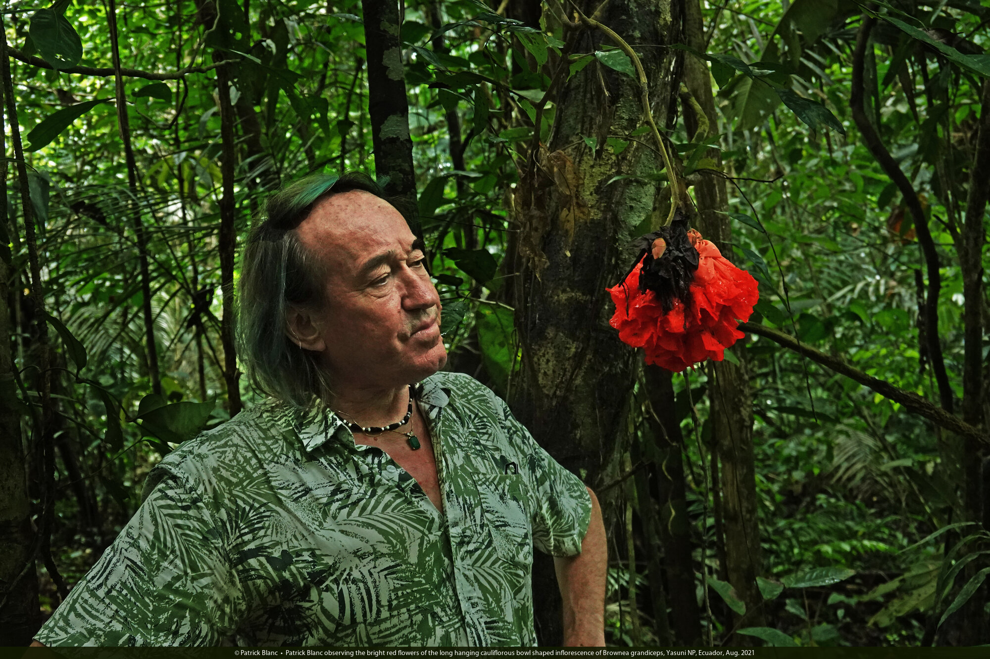 Patrick Blanc observing the bright red flowers of the long hanging cauliflorous bowl shaped inflorescence of Brownea grandiceps, Yasuni NP, Ecuador, Aug. 2021