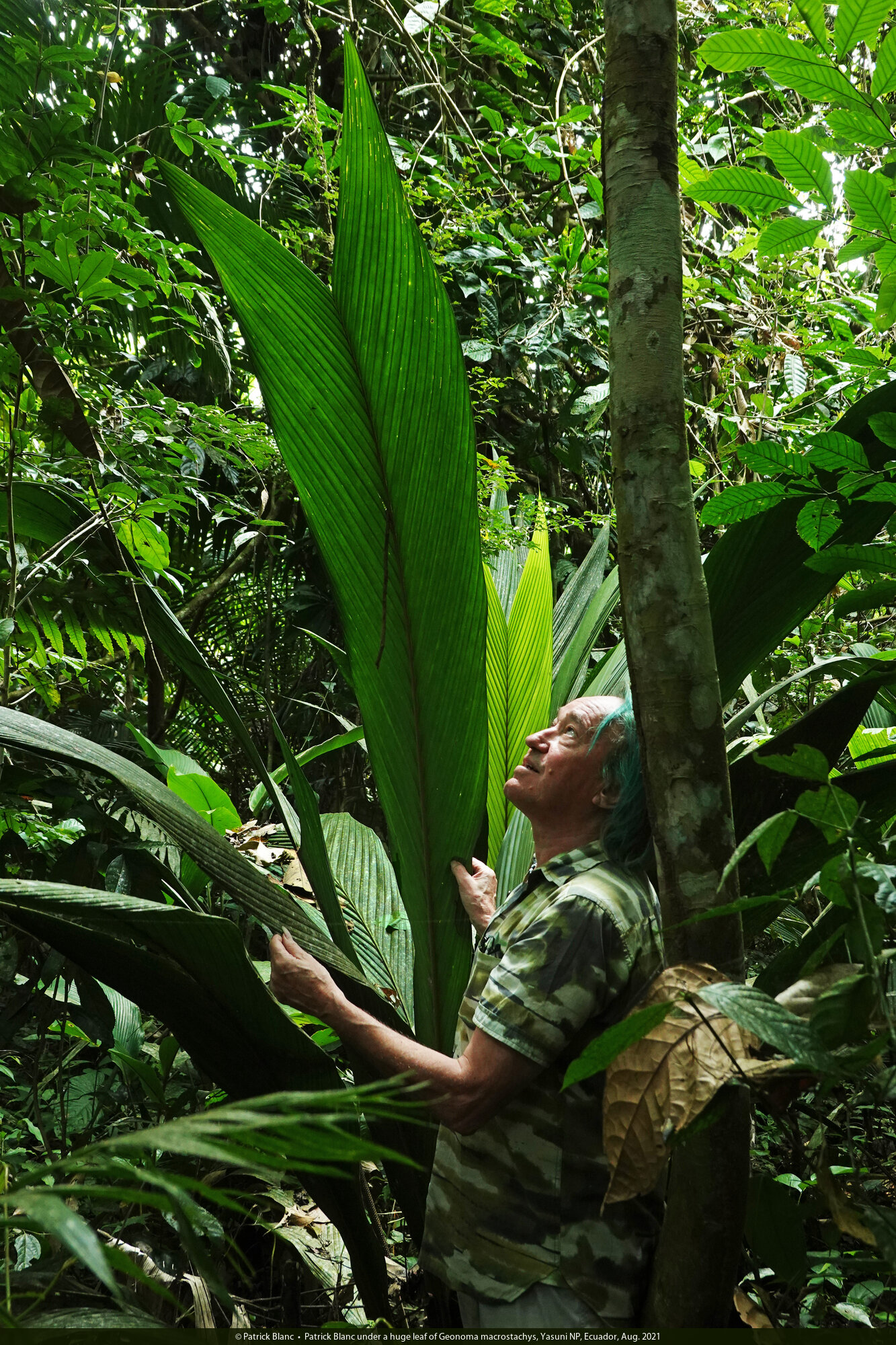 Patrick Blanc under a huge leaf of Geonoma macrostachys, Yasuni NP, Ecuador, Aug. 2021