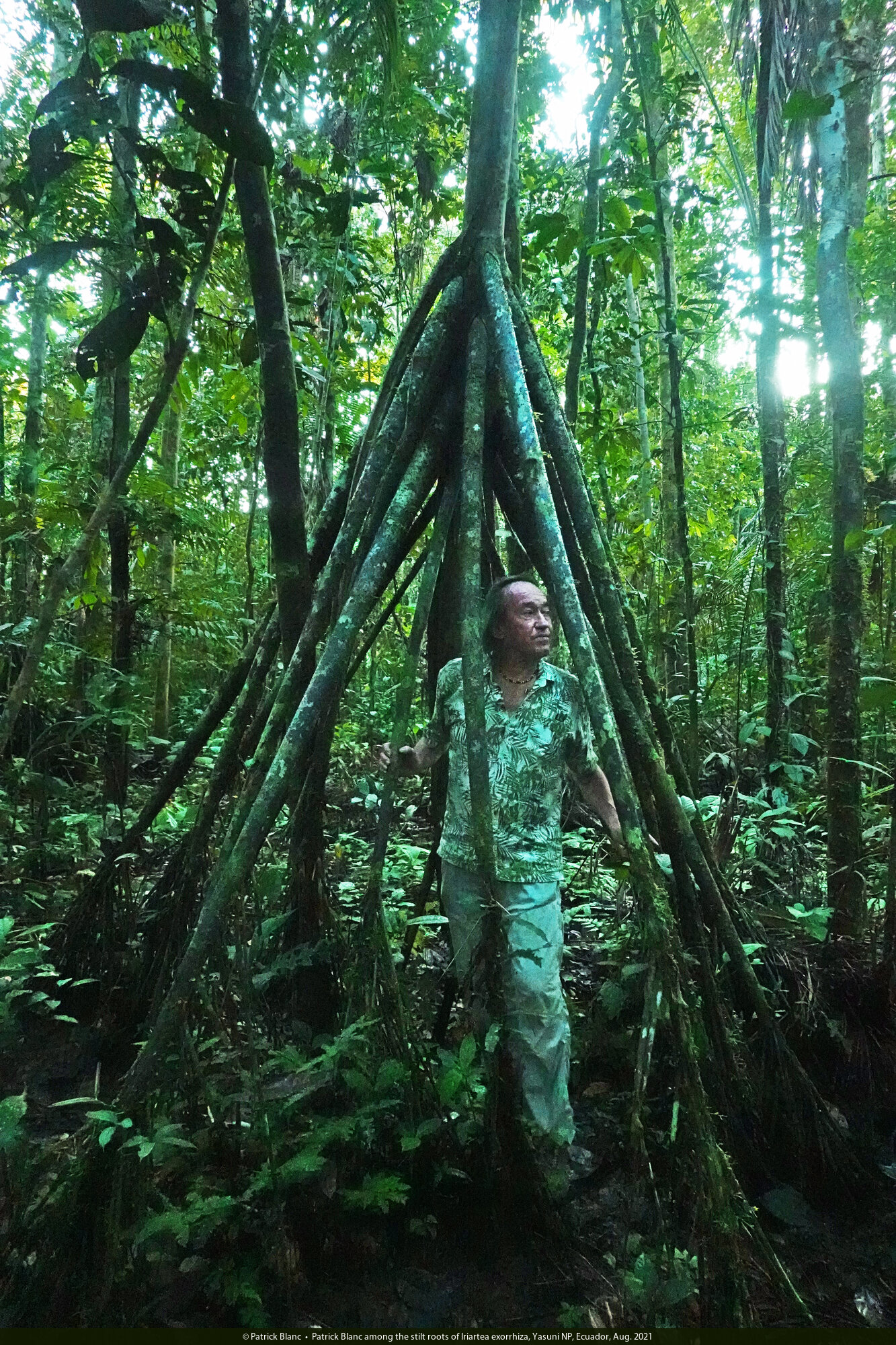Patrick Blanc among the stilt roots of Socratea exorrhiza, Yasuni NP, Ecuador, Aug. 2021