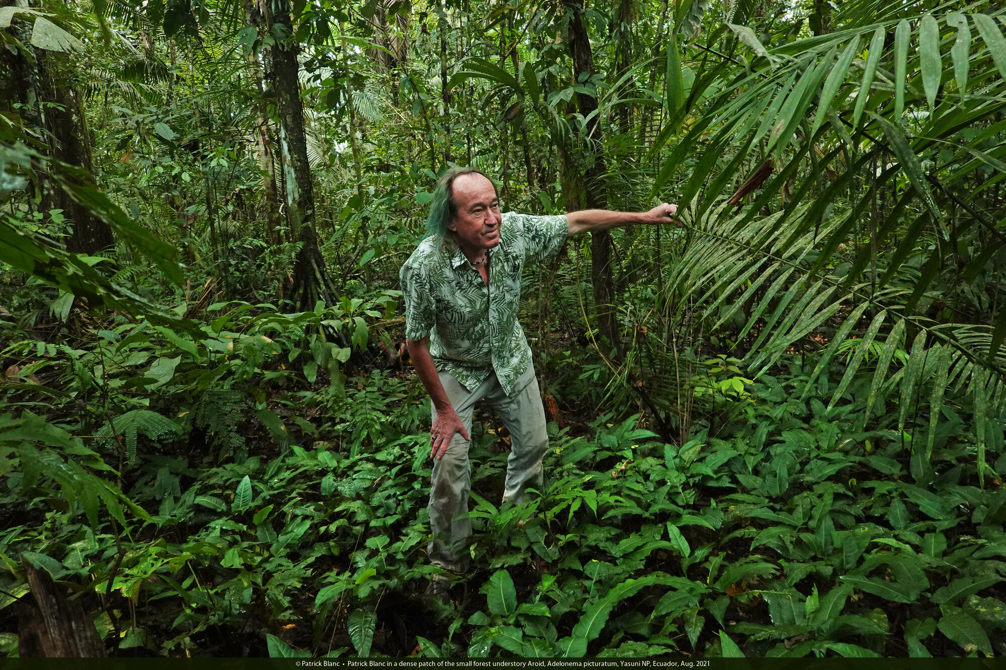 Patrick Blanc in a dense patch of the small forest understory Aroid, Adelonema picturatum, Yasuni NP, Ecuador, Aug. 2021