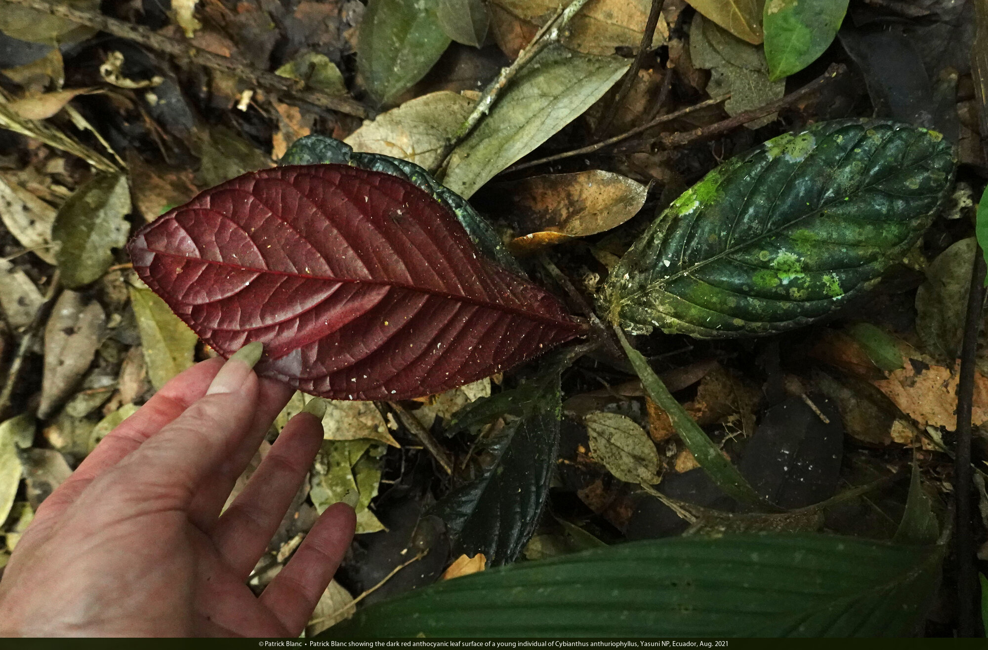 Patrick Blanc showing the dark red anthocyanic leaf surface of a young individual of Cybianthus anthuriophyllus, Yasuni NP, Ecuador, Aug. 2021