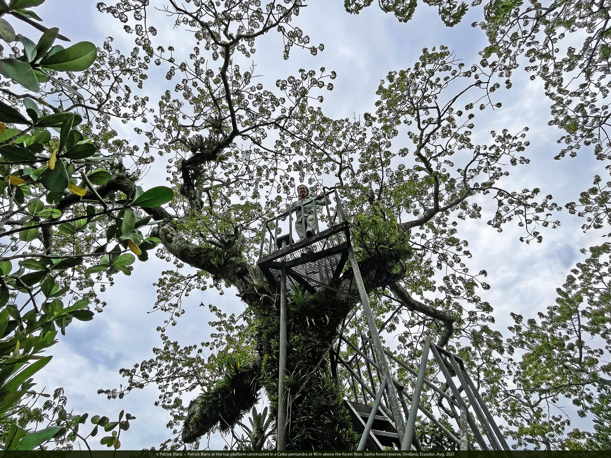 Patrick Blanc at the top platform constructed in a Ceiba pentandra at 40 m above the forest floor, Sacha forest reserve, Orellana, Ecuador, Aug. 2021