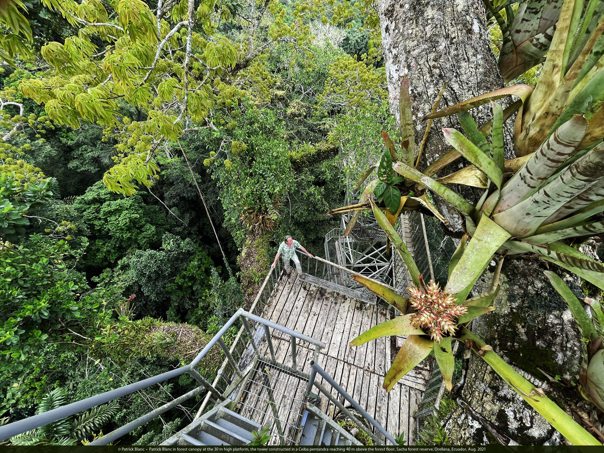 Patrick Blanc in forest canopy at the 30 m high platform, the tower constructed in a Ceiba pentandra reaching 40 m above the forest floor, Sacha forest reserve, Orellana, Ecuador, Aug. 2021
