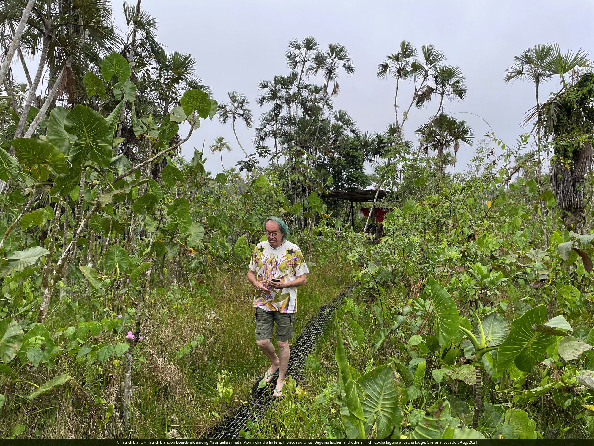 Patrick Blanc on boardwalk among Mauritiella armata, Montrichardia linifera, Hibiscus sororius, Begonia fischeri and others, Pilchi Cocha laguna at Sacha lodge, Orellana, Ecuador, Aug. 2021