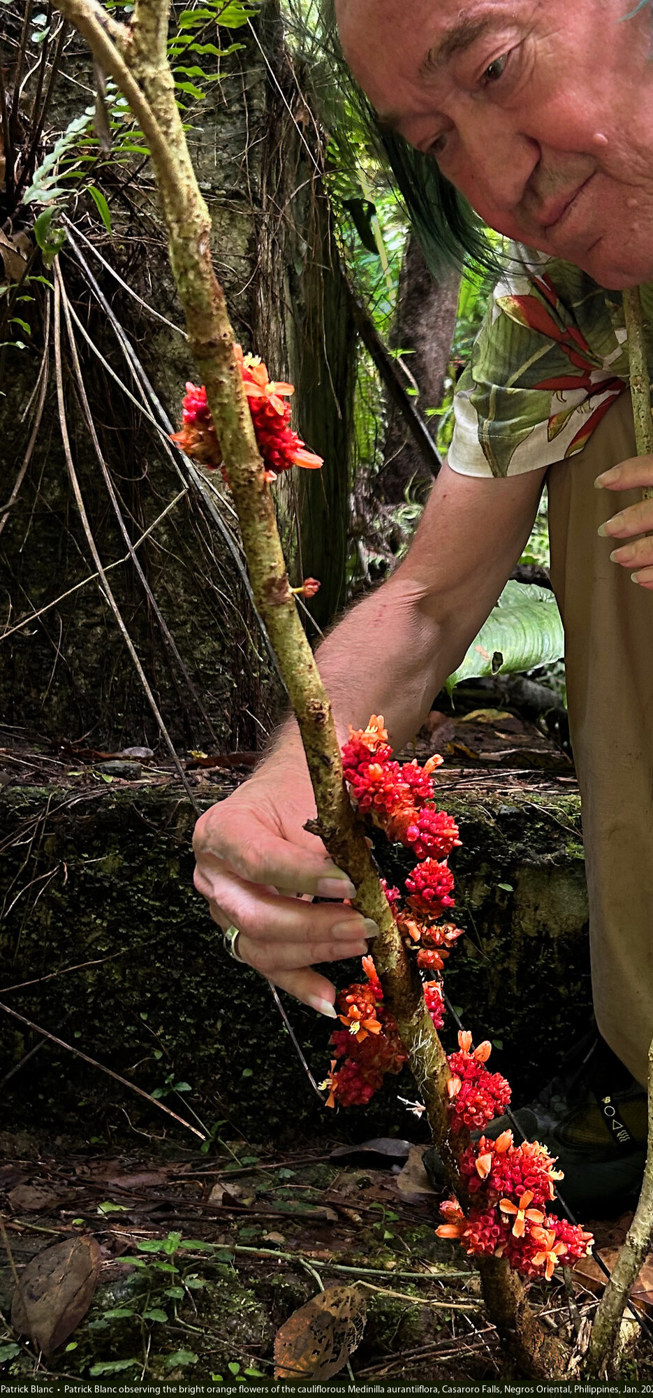 Patrick Blanc observing the bright orange flowers of the cauliflorous Medinilla aurantiiflora, Casaroro Falls, Negros Oriental, Philippines, Jan. 2025