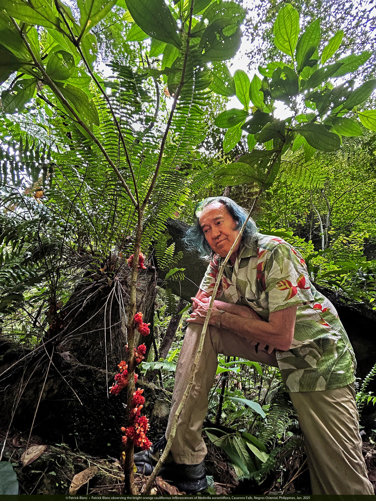 Patrick Blanc observing the bright orange cauliflorous inflorescences of Medinilla aurantiiflora, Casaroro Falls, Negros Oriental, Philippines, Jan. 2025