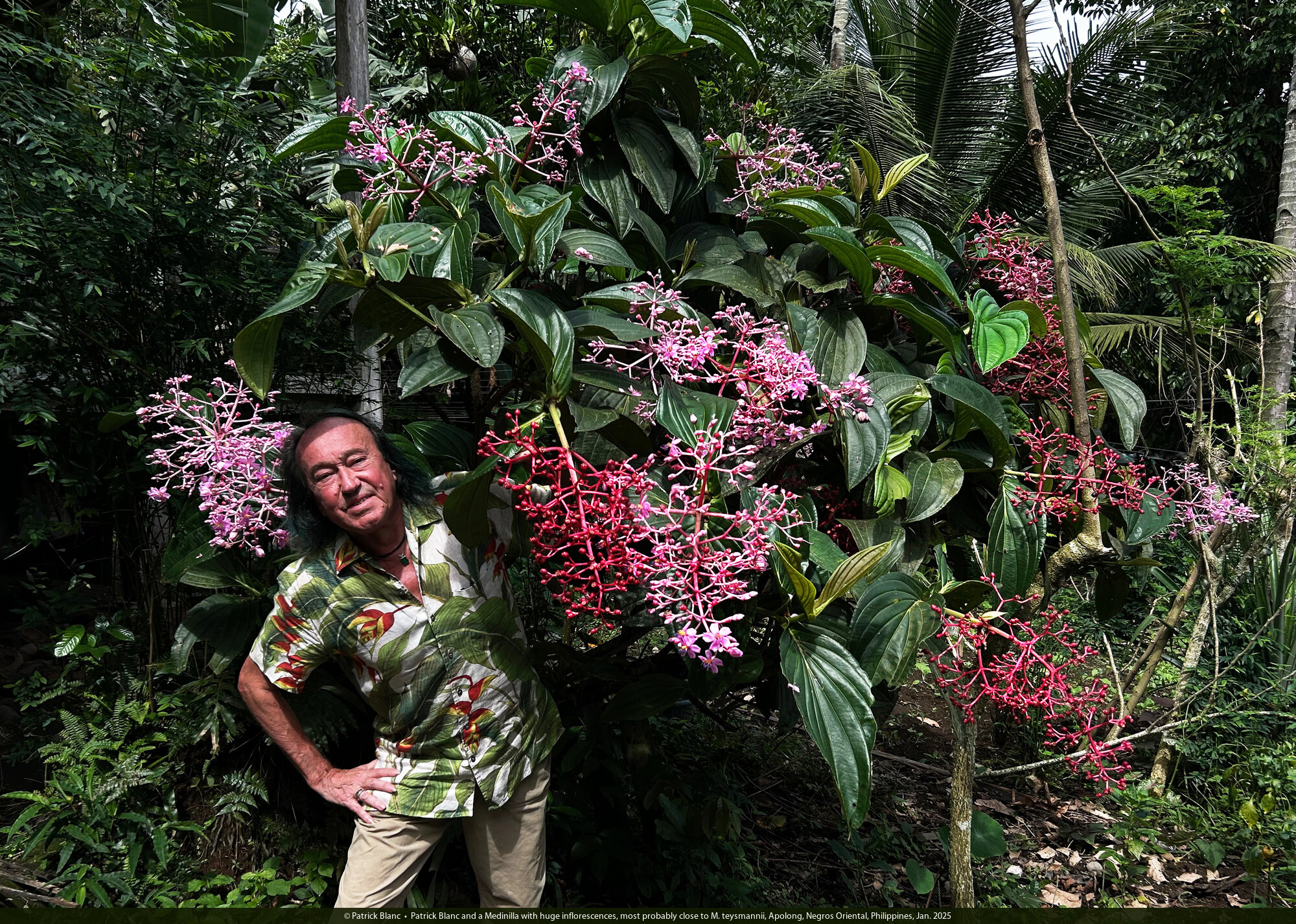 Patrick Blanc and a Medinilla with huge inflorescences, most probably close to M. teysmannii, Apolong, Negros Oriental, Philippines, Jan. 2025