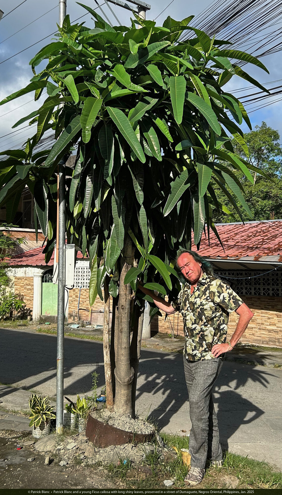 Patrick Blanc and a young Ficus callosa with long shiny leaves, preserved in a street of Dumaguete, Negros Oriental, Philippines, Jan. 2025