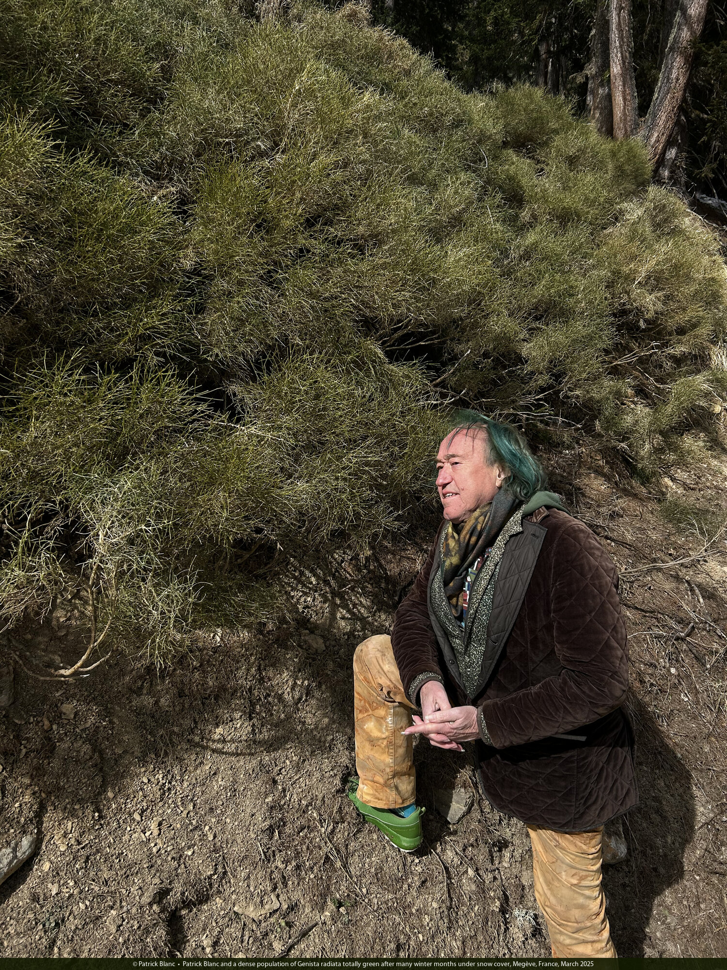 Patrick Blanc and a dense population of Genista radiata totally green after many winter months under snow cover, Megève, France, March 2025