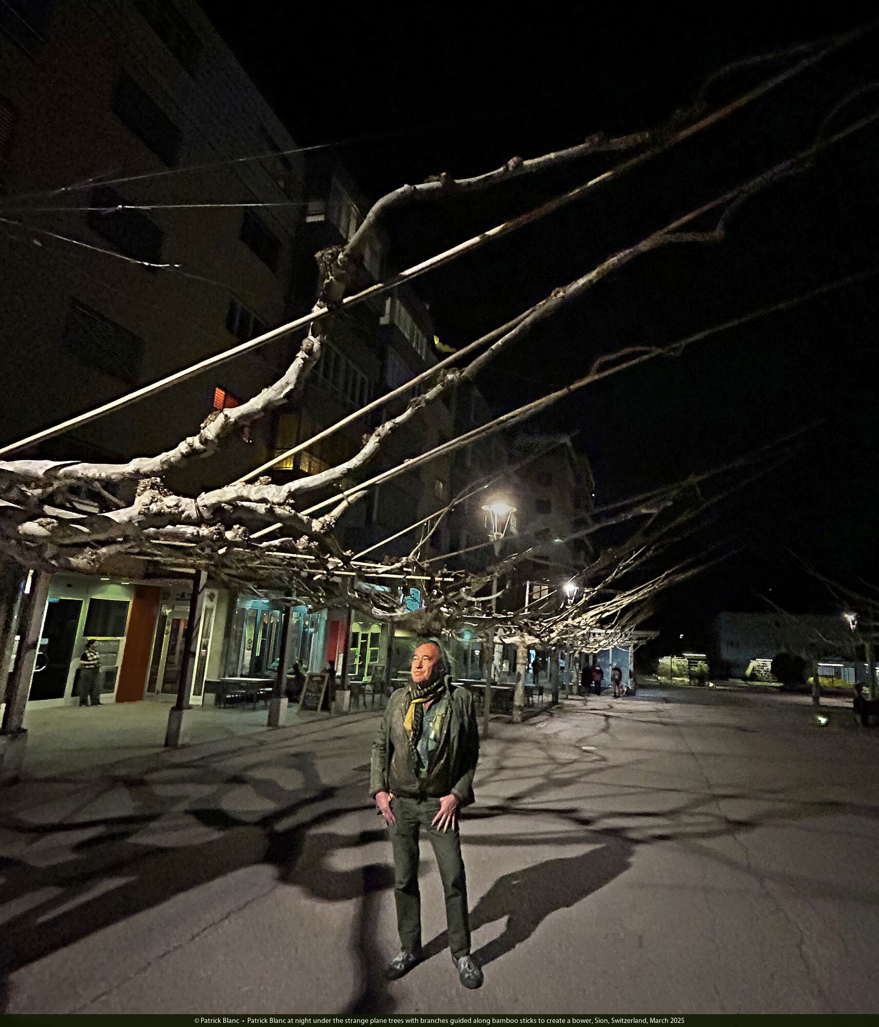 Patrick Blanc at night under the strange plane trees with branches guided along bamboo sticks to create a bower, Sion, Switzerland, March 2025