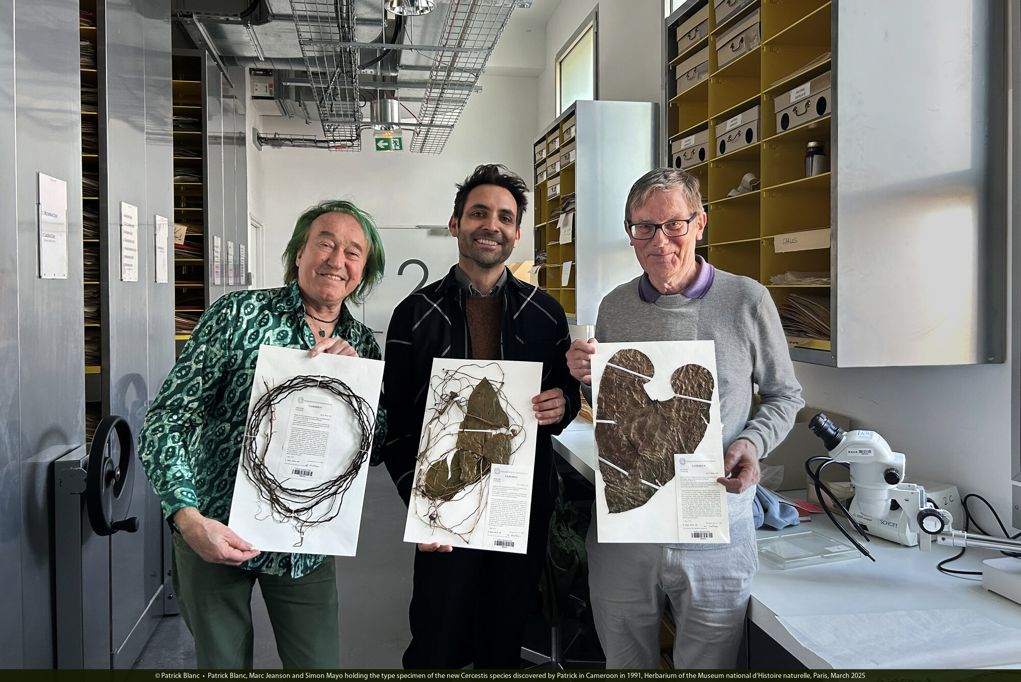 Patrick Blanc, Marc Jeanson and Simon Mayo holding the type specimen of Cercestis blancii, the new species discovered by Patrick in Cameroon in 1991, Herbarium of the Museum national d'Histoire naturelle, Paris, March 2025