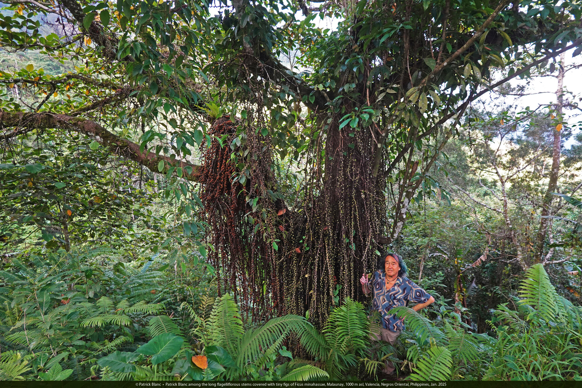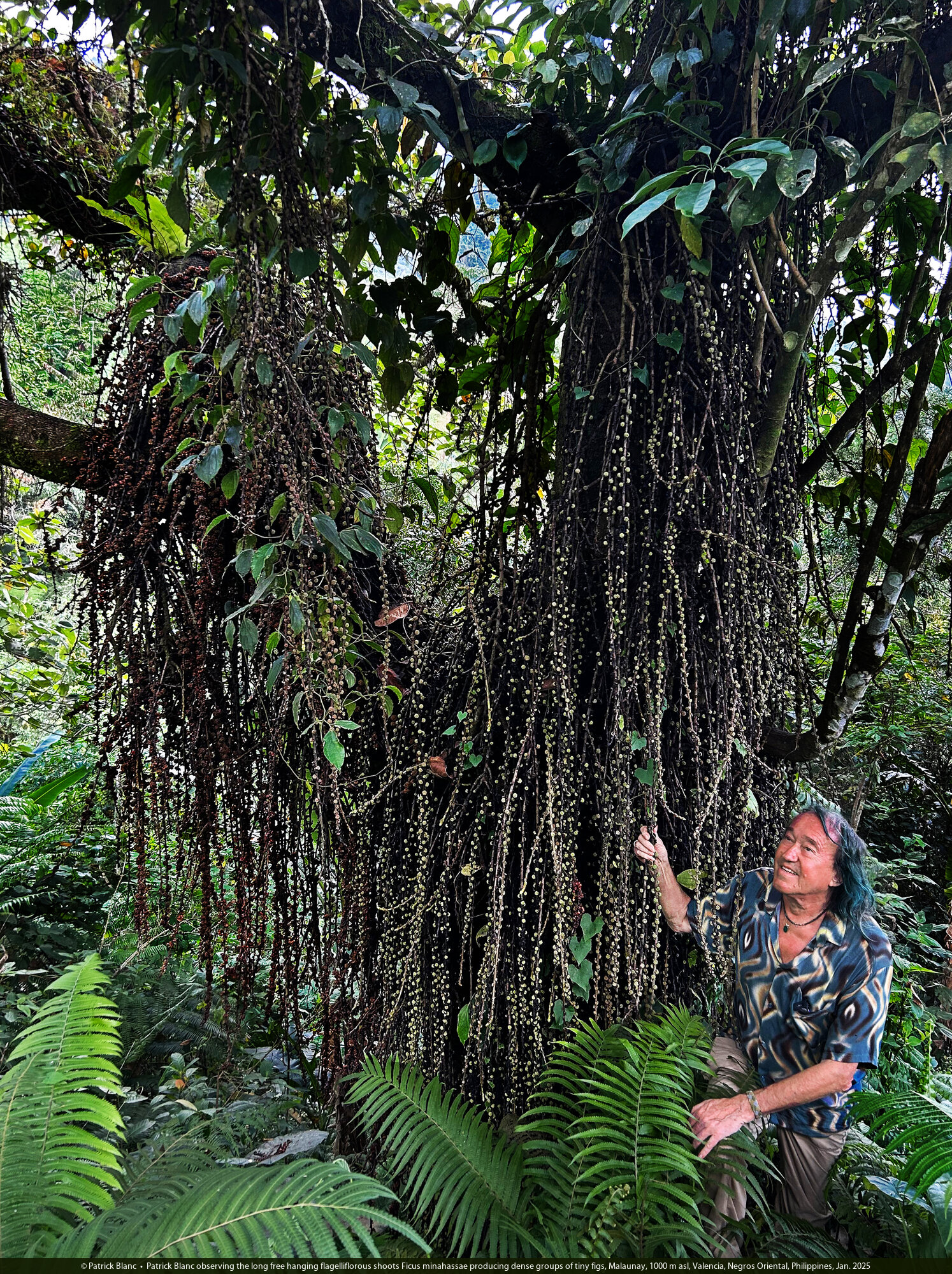 Patrick Blanc observing the long free hanging flagelliflorous shoots Ficus minahassae producing dense groups of tiny figs, Malaunay, 1000 m asl, Valencia, Negros Oriental, Philippines, Jan. 2025