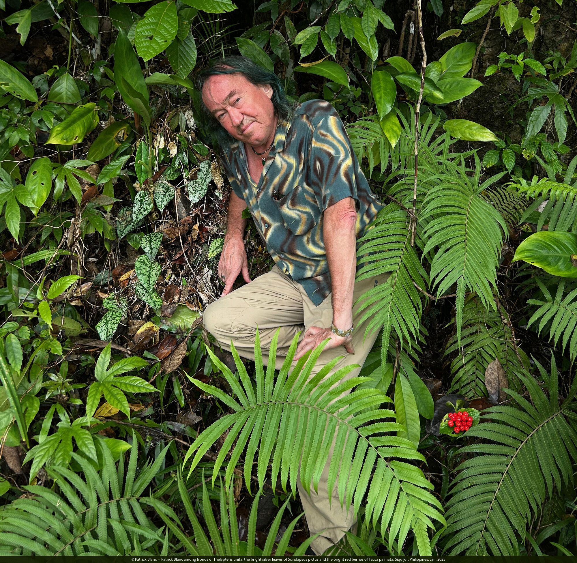 Patrick Blanc among fronds of Thelypteris unita, the bright silver leaves of Scindapsus pictus and the bright red berries of Tacca palmata, Siquijor, Philippines, Jan. 2025