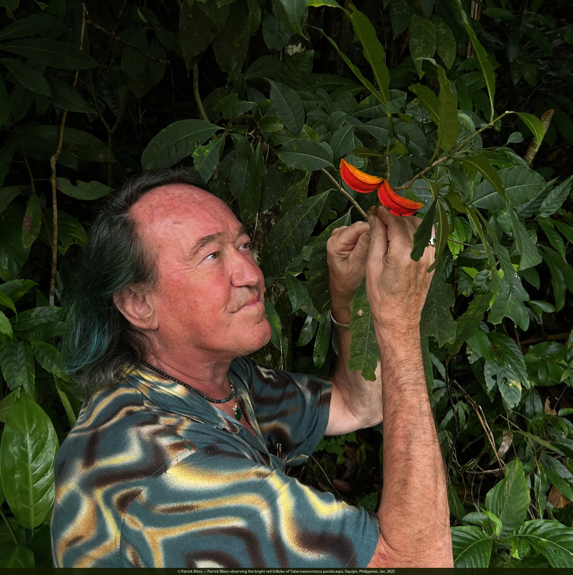 Patrick Blanc observing the bright red follicles of Tabernaemontana pandacaqui, Siquijor, Philippines, Jan. 2025