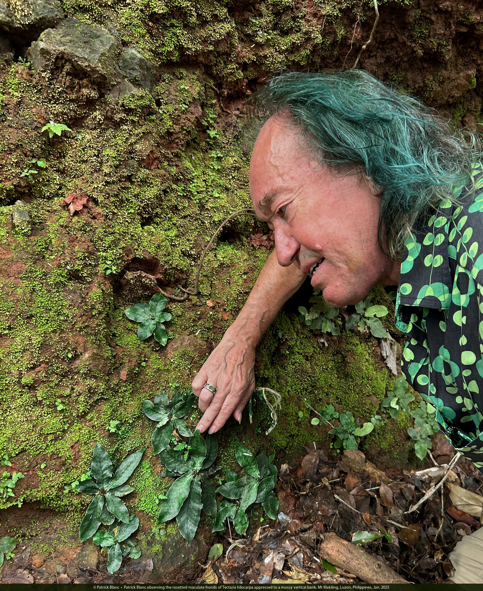Patrick Blanc observing the rosetted maculate fronds of Tectaria hilocarpa appressed to a mossy vertical bank, Mt Makiling, Luzon, Philippines, Jan. 2025