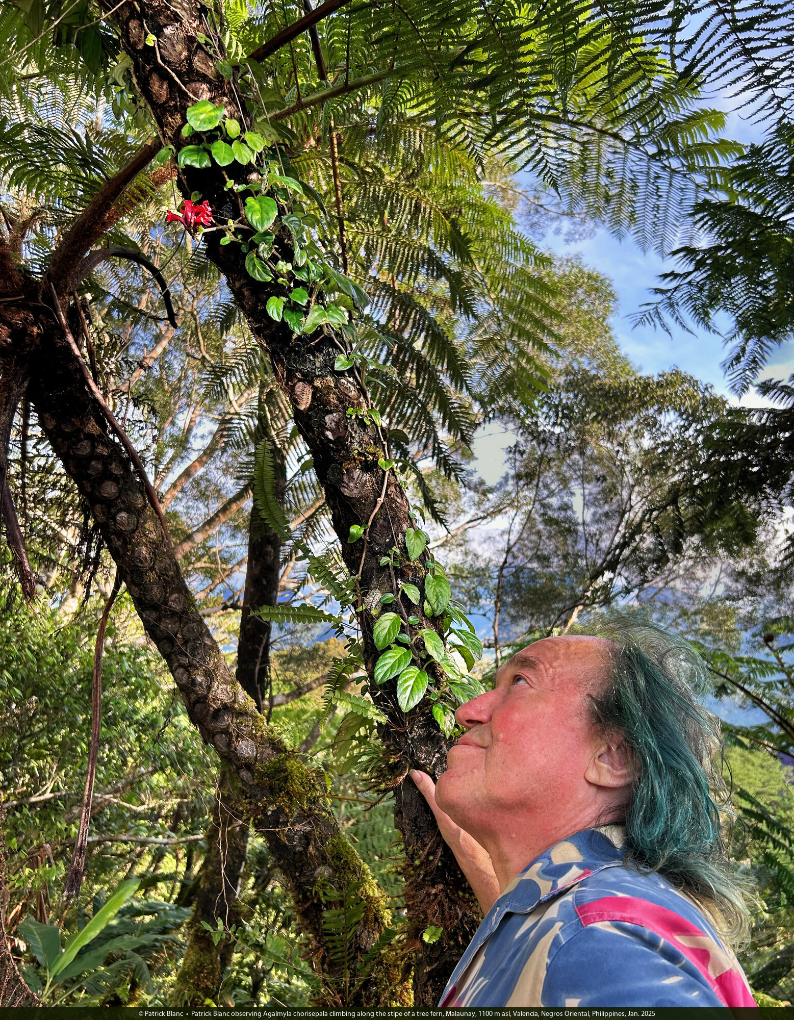 Patrick Blanc observing Agalmyla chorisepala climbing along the stipe of a tree fern, Malaunay, 1100 m asl, Valencia, Negros Oriental, Philippines, Jan. 2025
