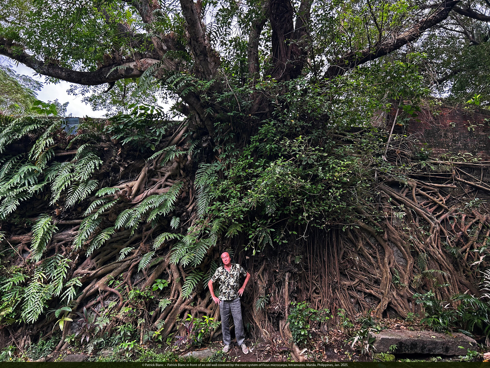 Patrick Blanc in front of an old wall covered by the root system of Ficus microcarpa, Intramuros, Manila, Philippines, Jan. 2025