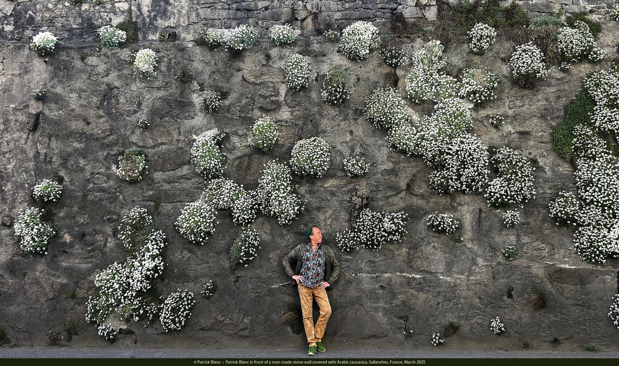 Patrick Blanc in front of a man made stone wall covered with Arabis caucasica, Sallanches, France, March 2025