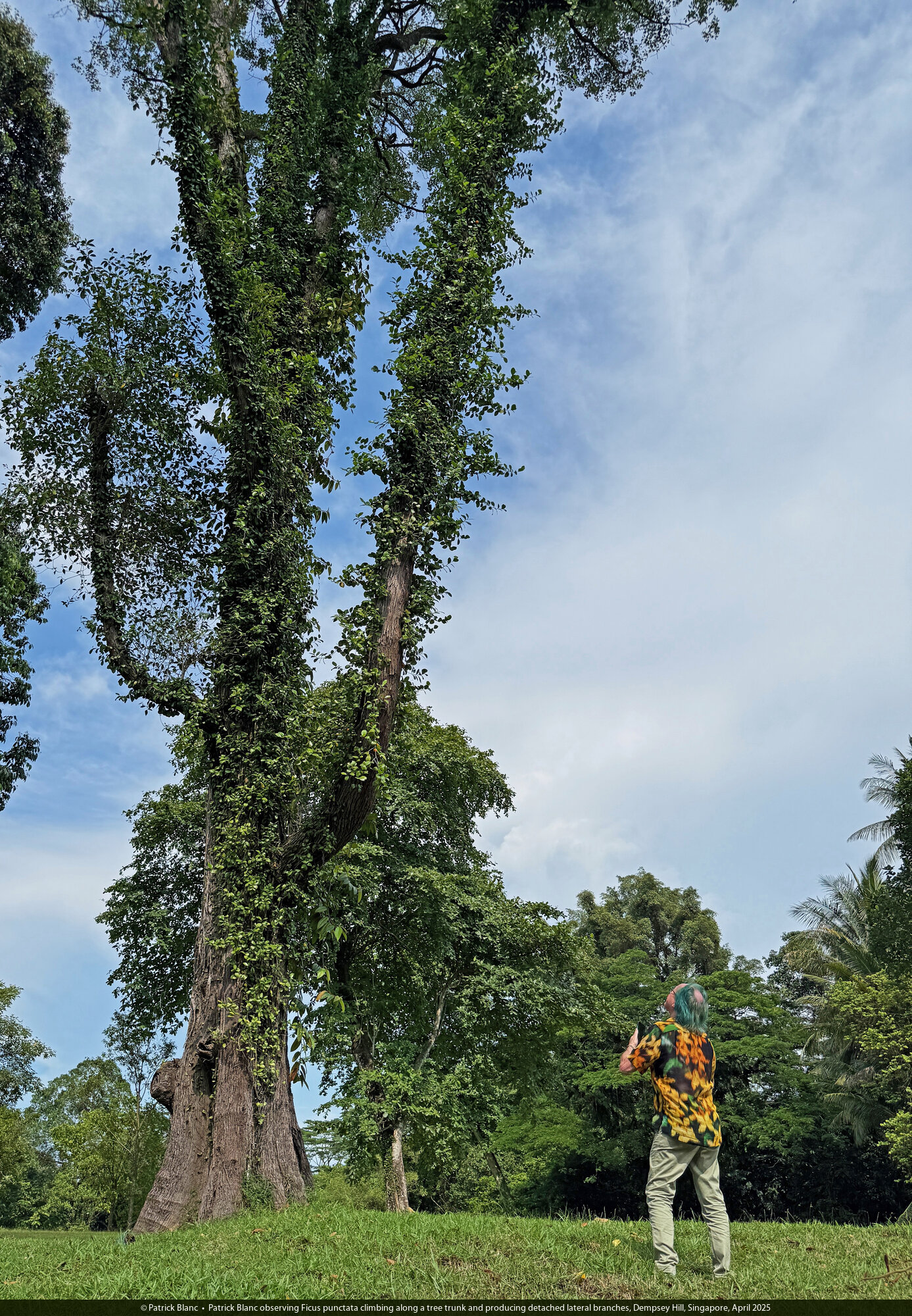 Patrick Blanc observing Ficus punctata climbing along a tree trunk and producing detached lateral branches, Dempsey Hill, Singapore, April 2025
