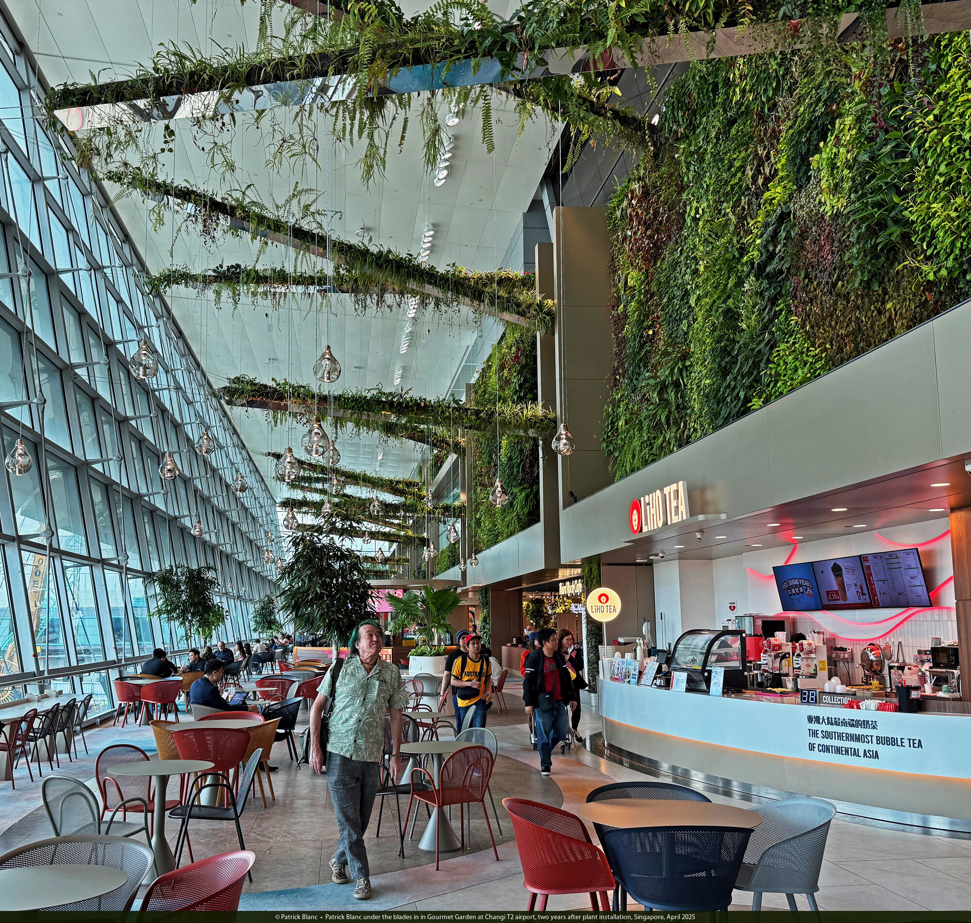 Patrick Blanc under the blades in in Gourmet Garden at Changi T2 airport, two years after plant installation, Singapore, April 2025