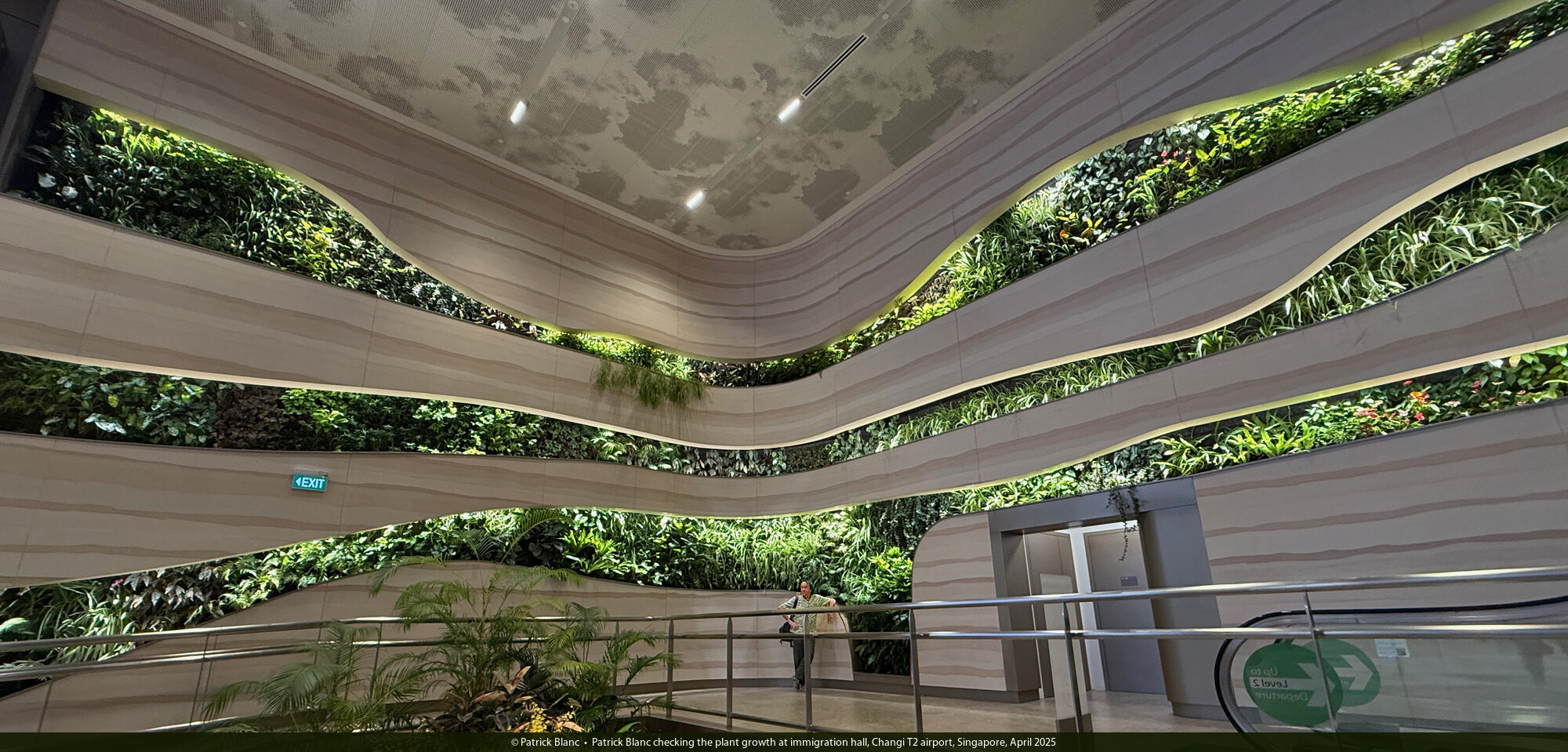 Patrick Blanc checking the plant growth at immigration hall, Changi T2 airport, Singapore, April 2025