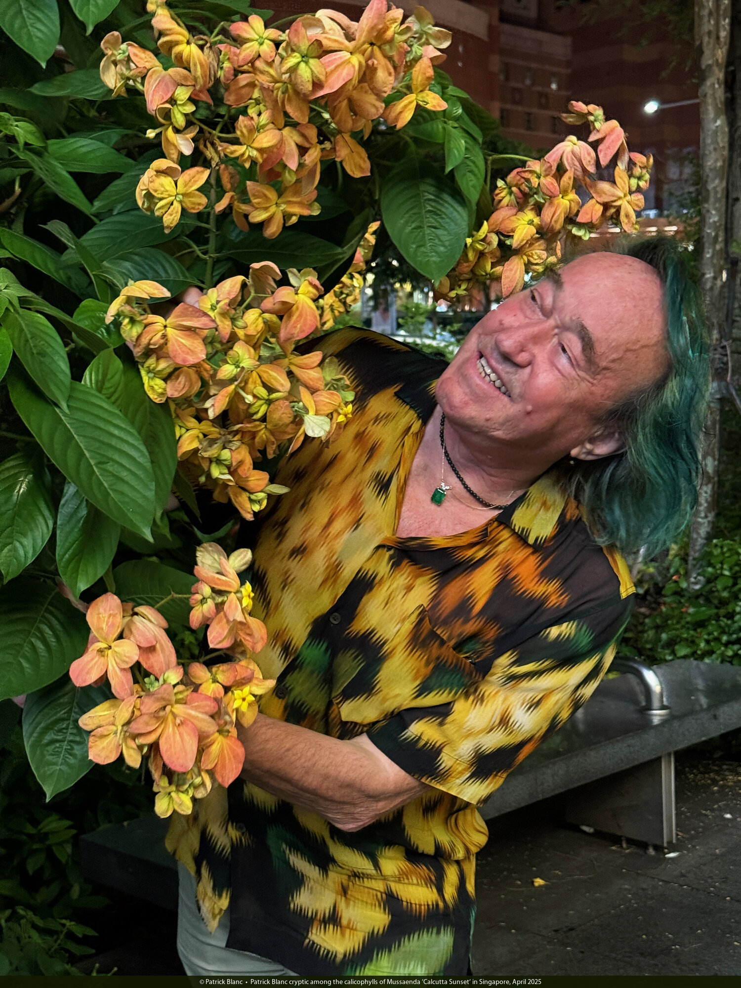 Patrick Blanc cryptic among the calicophylls of Mussaenda 'Calcutta Sunset' in Singapore, April 2025