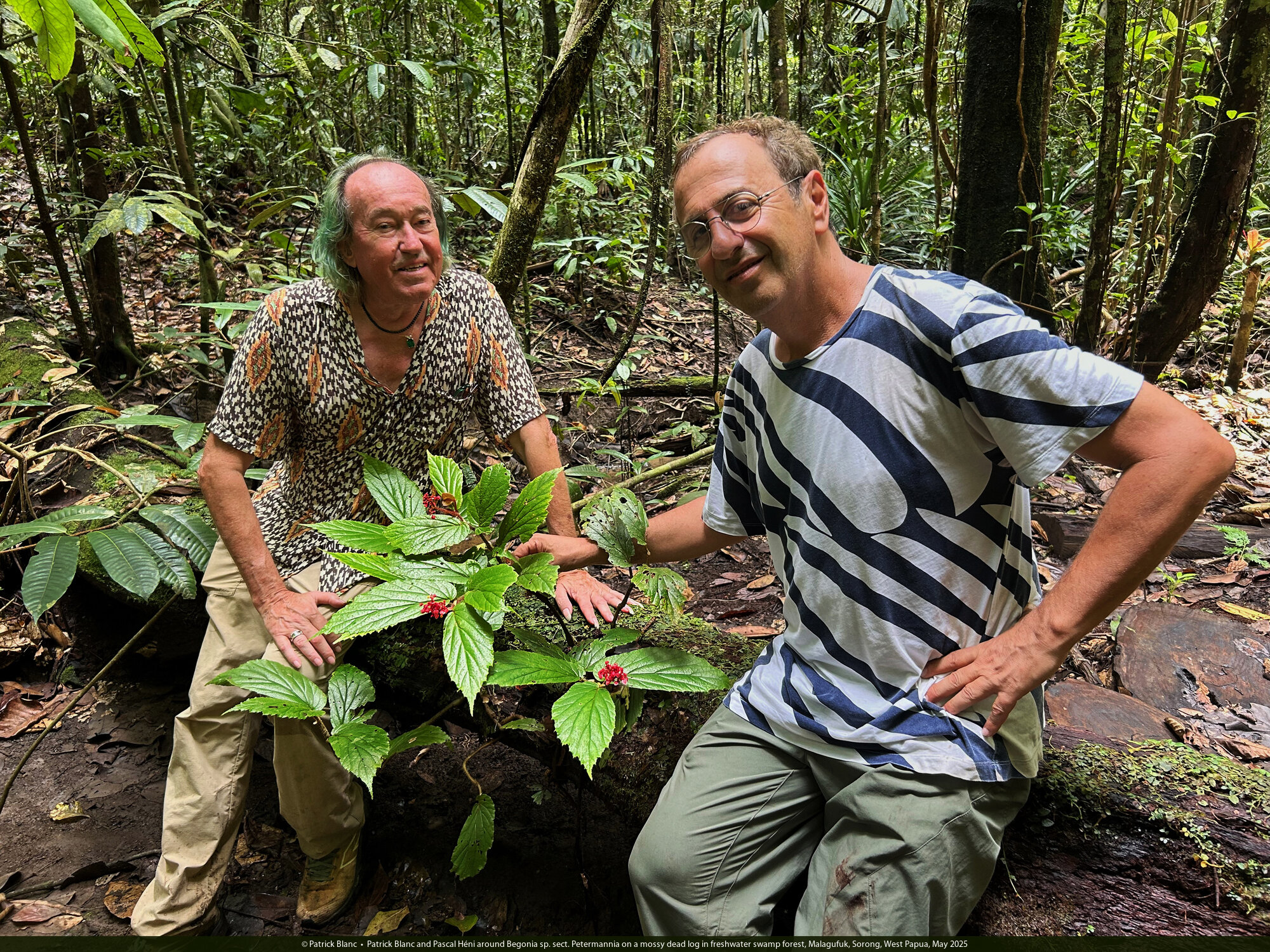 Patrick Blanc and Pascal Héni around Begonia sp. sect. Petermannia on a mossy dead log in freshwater swamp forest, Malagufuk, Sorong, West Papua, May 2025