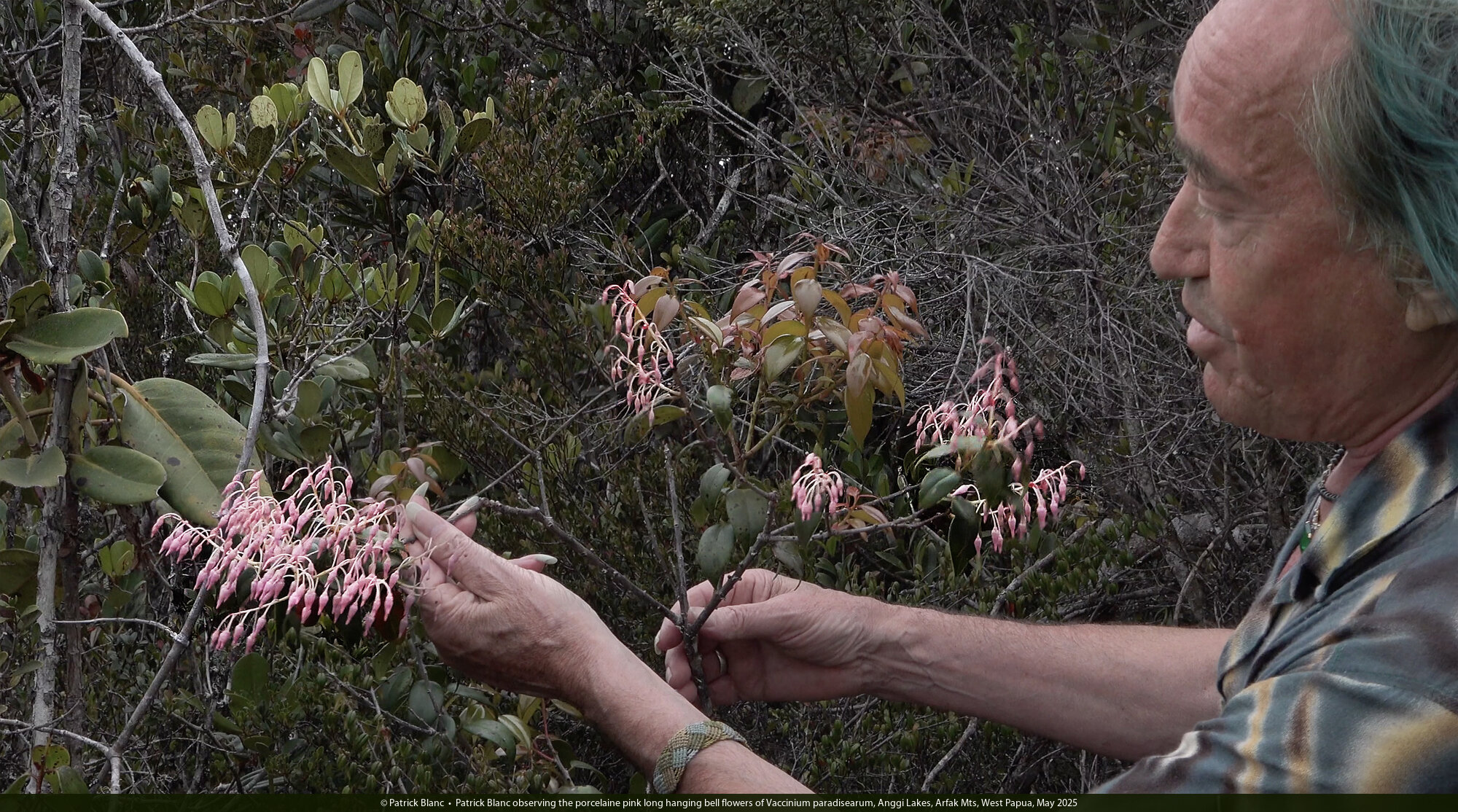 Patrick Blanc observing the porcelaine pink long hanging bell flowers of Vaccinium paradisearum, Anggi Lakes, Arfak Mts, West Papua, May 2025