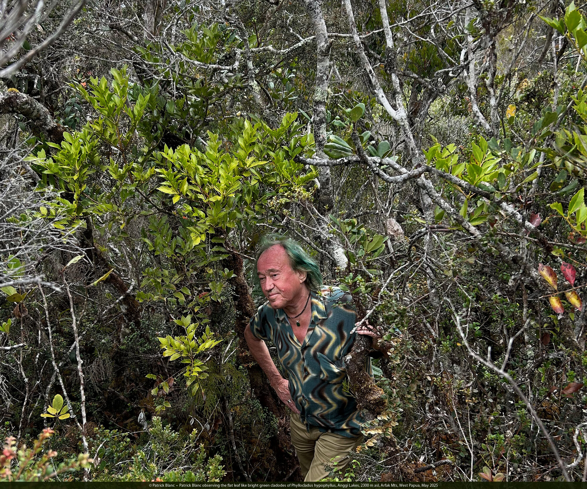 Patrick Blanc observing the flat leaf like bright green cladodes of Phyllocladus hypophyllus, Anggi Lakes, 2300 m asl, Arfak Mts, West Papua, May 2025