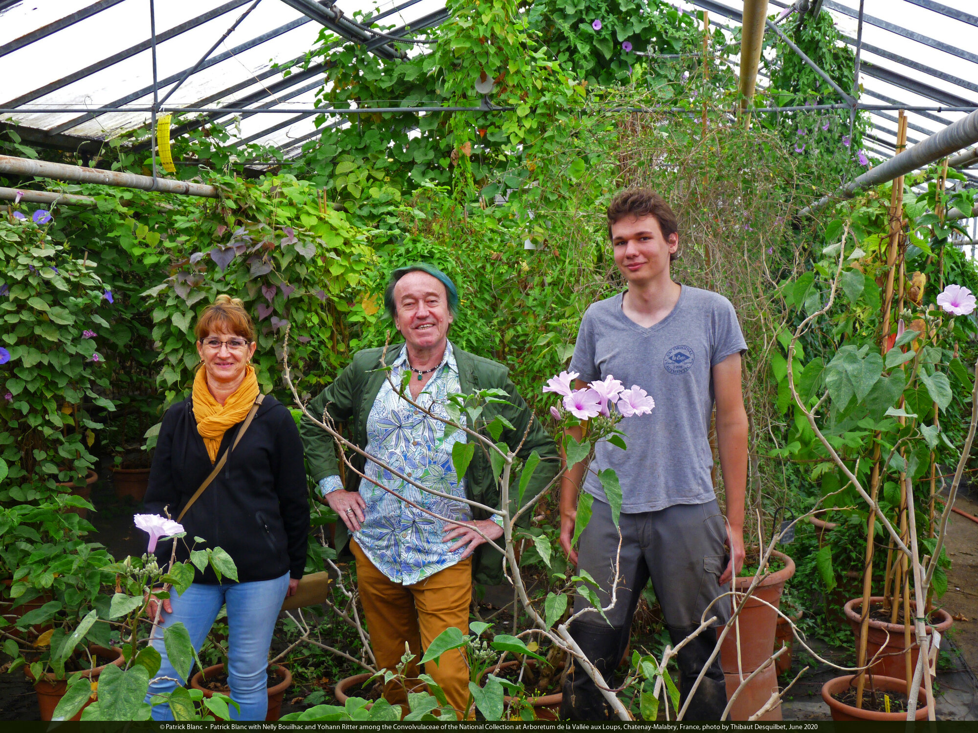 Patrick Blanc with Nelly Bouilhac and Yohann Ritter among the Convolvulaceae of the National Collection at Arboretum de la Vallée aux Loups, Chatenay-Malabry, France, photo by Thibaut Desquilbet, June 2020