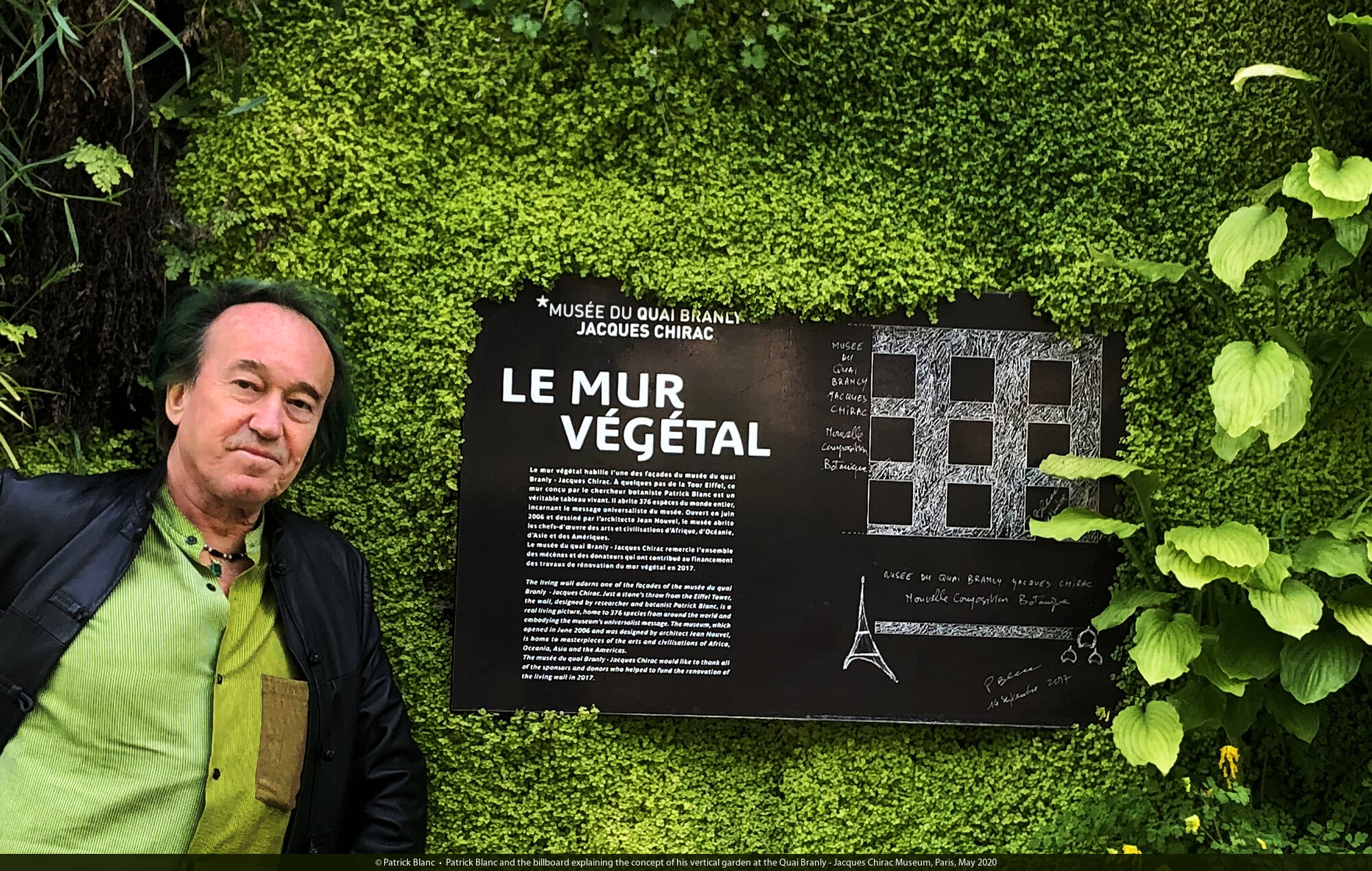 Patrick Blanc and the billboard explaining the concept of his vertical garden at the Quai Branly - Jacques Chirac Museum, Paris, May 2020
